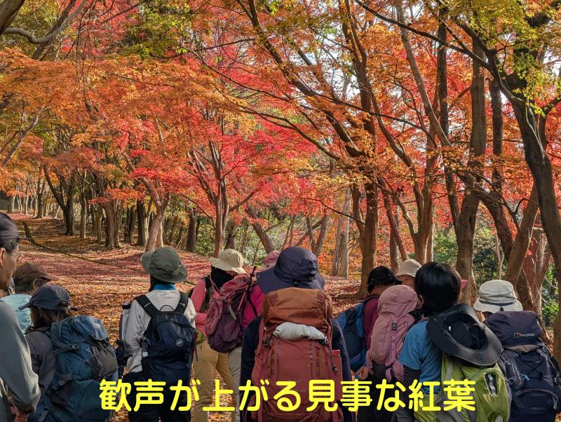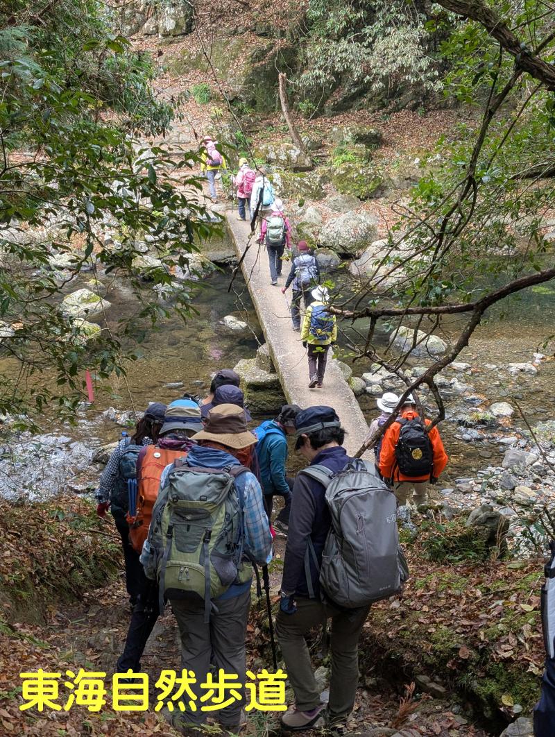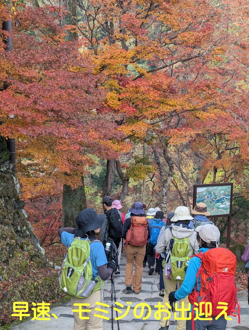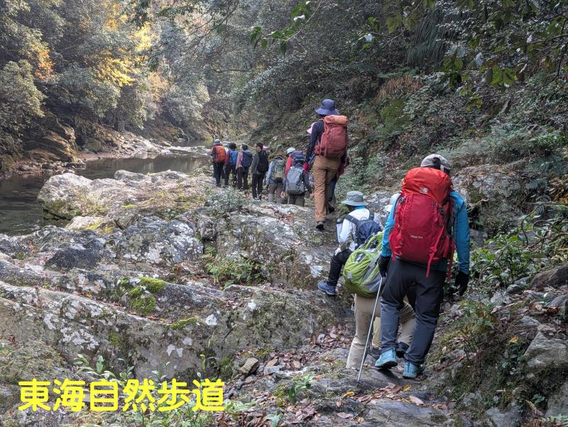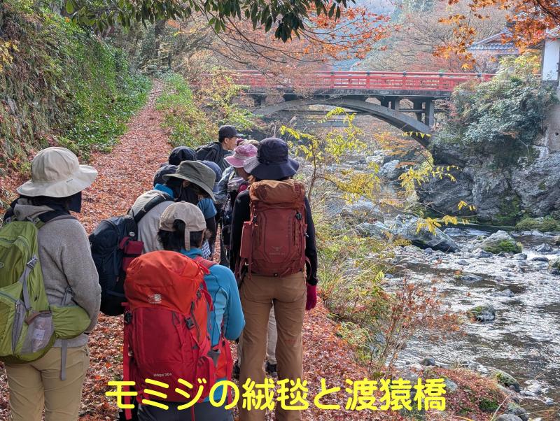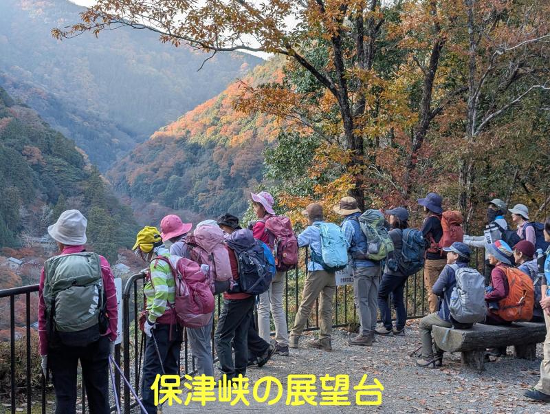 季節外れの暖かさとなった初冬の京都を、残りモミジを求めて高雄から清滝川沿いに嵐山まで歩く。高雄周辺は紅葉も終盤を迎えていたが、嵐山に近づくにつれて鮮やかさが増し、歓声が上がる事もしばしば。清滝川沿いの東海自然歩道は、澄み切った清流の水音を聞きながら、多少足元の悪い岩床をアップダウンしながら楽しく歩く事が出来た。小倉山を越え、保津峡の展望台から行き交う遊覧船や紅葉を眺めた後、賑わう嵐山で解散した(T.N)