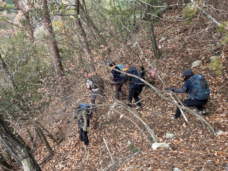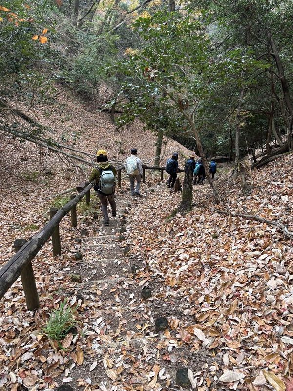 参加者8名JR唐崎スタート(体験山行1名含)。住宅地を抜けて尾根にとりつくと1座目忠兵衛山(青山)。ジグザグ道沿いに落ち葉が堆積し滑りをこらえての登りです。続いて2座目は古墳があったという2座目壺笠山。ザレた急下りをこらえて真東に位置する3座目は神輿山。東海道自然歩道に合流し崇福寺跡、志賀大仏を見たのち京阪滋賀里へ下山。近江坂本から京都一条寺に抜ける白鳥越ルートの山城跡を歩きました。