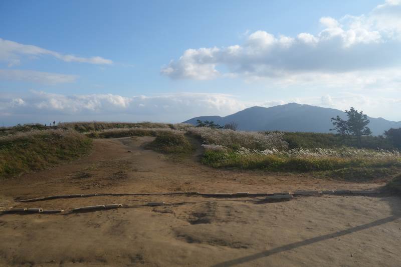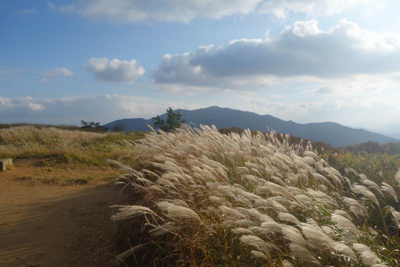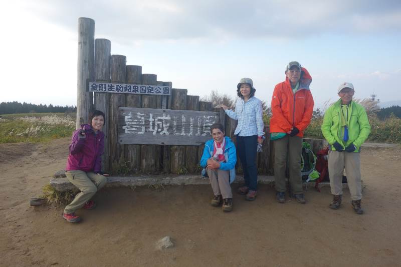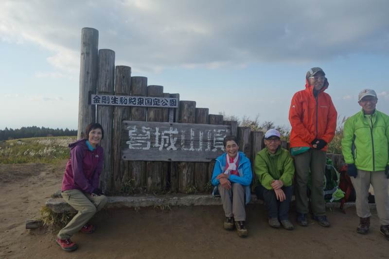 葛城山の北尾根登山道と合流するあたりから連続する階段を何とか登りきると、ススキの原が広がる山頂へ到着。
