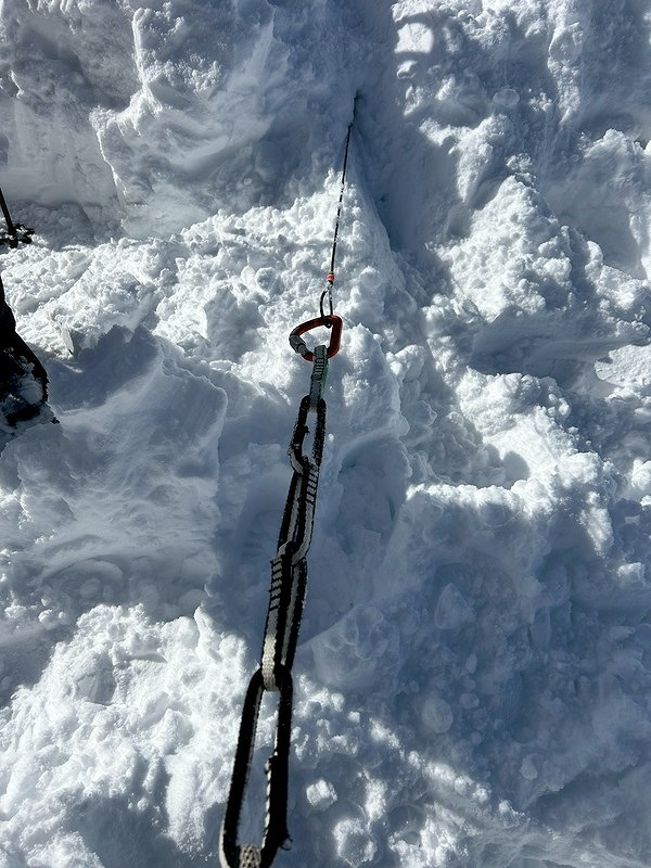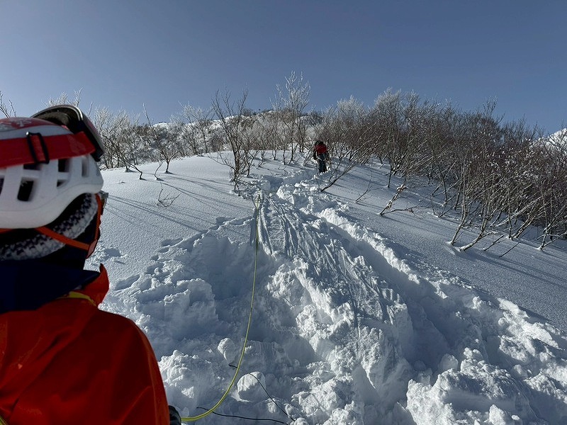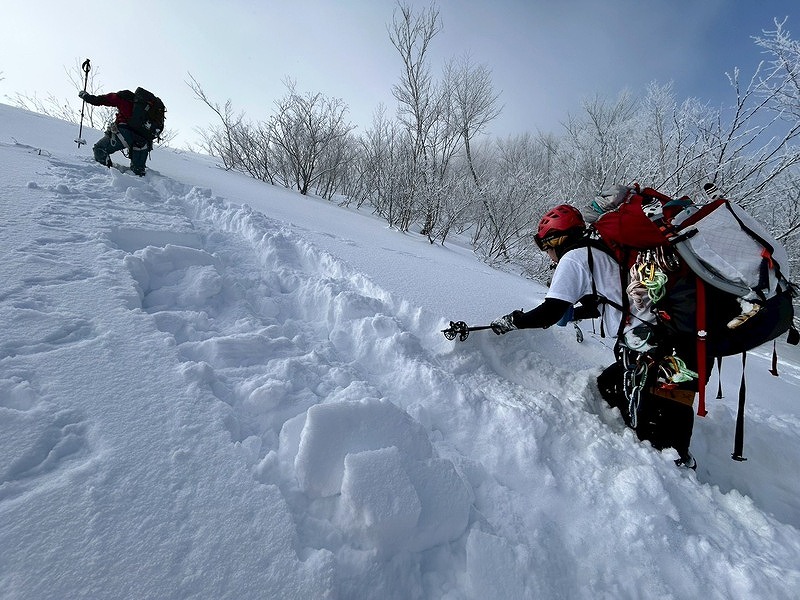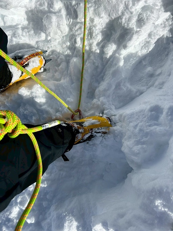 最初からワカンラッセルでスピードが上がらず、ピークハントはあきらめて適地でトレーニング開始。グローブをしたまま時間内での装備装着、フィックスロープ、支点構築、制動確保、ビーコン探索など充実したトレーニングが出来ました。