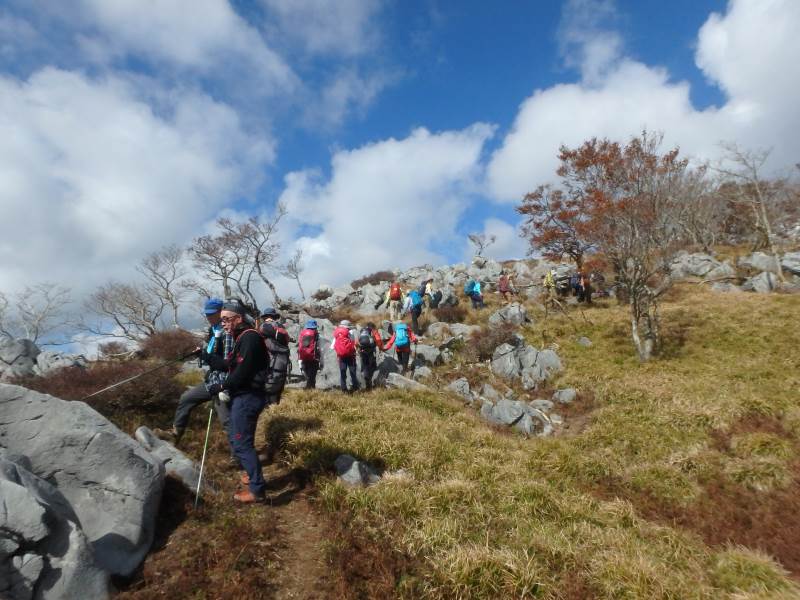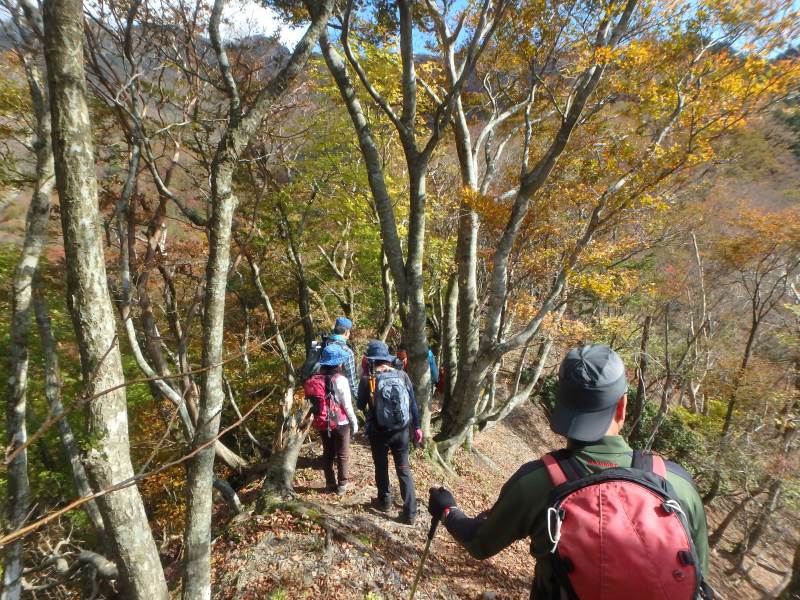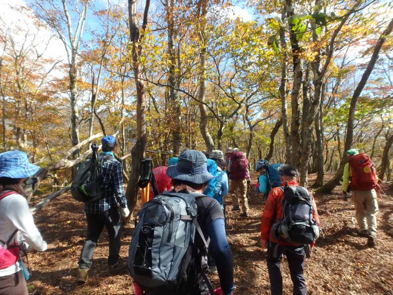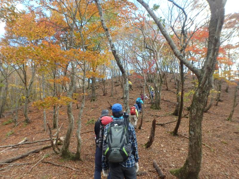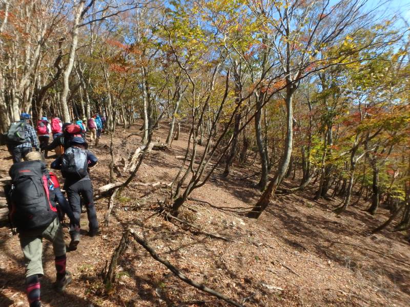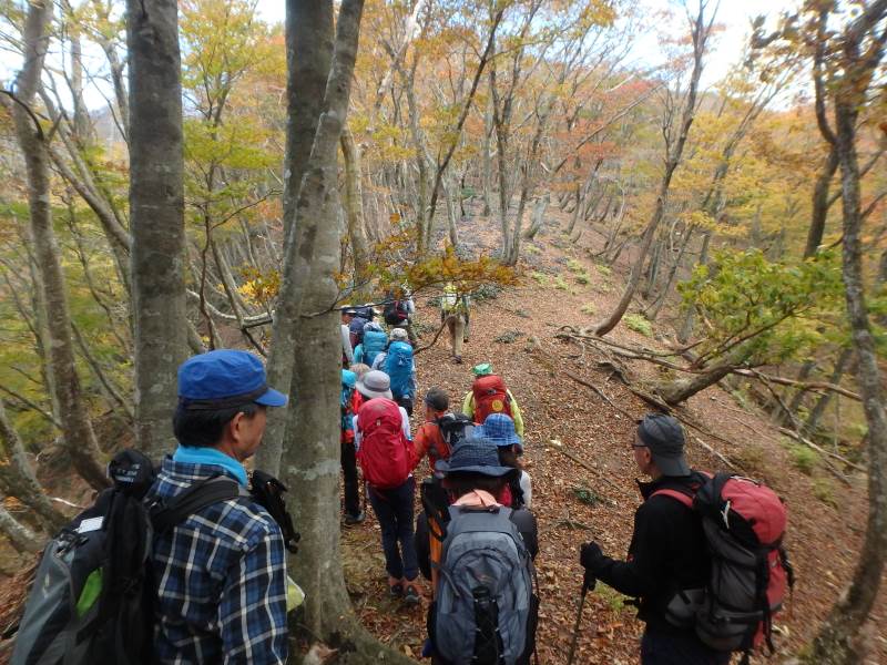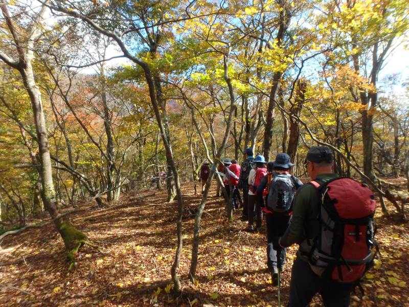 鈴鹿山脈最高峰の御池岳(1,247m)を、T字型をした通称「T字尾根」から登りました。早朝山科を出発し、東近江市君ヶ畑の集落を過ぎた空き地に車4台を駐車。登山口からの急登をゆっくり40分ほど歩くと、T字の横棒の左端に当たる尾根に到着。そこから、横棒と縦棒の交差点であるP918までは、緩やかなアップダウンを繰り返す。P918からほぼ90度方向転換して今度は縦棒をテーブルランドまで歩く。陽だまりの中、ブナ林の黄葉が美しい。易しい岩場ややせ尾根、急な下りなど、変化に富んだ尾根は楽しい。テーブルランドに上がってボタンブチや天狗の鼻から見下ろすと、秋色に染まったT字尾根がくっきりと判別できる。昼食後、足早に御池岳山頂へ登ったあと、奥の平を回って土倉岳への急坂を下り、ノタノ坂を経て駐車場へ戻った。(S.I)