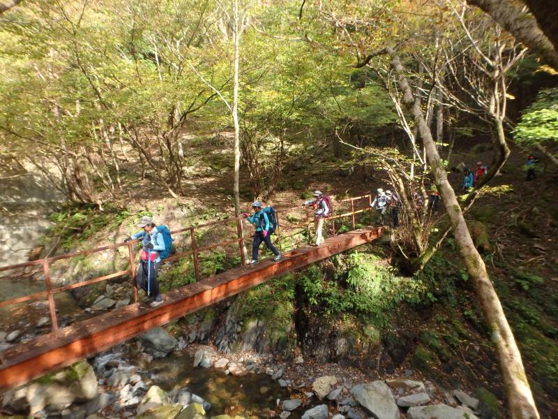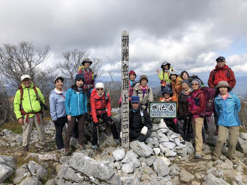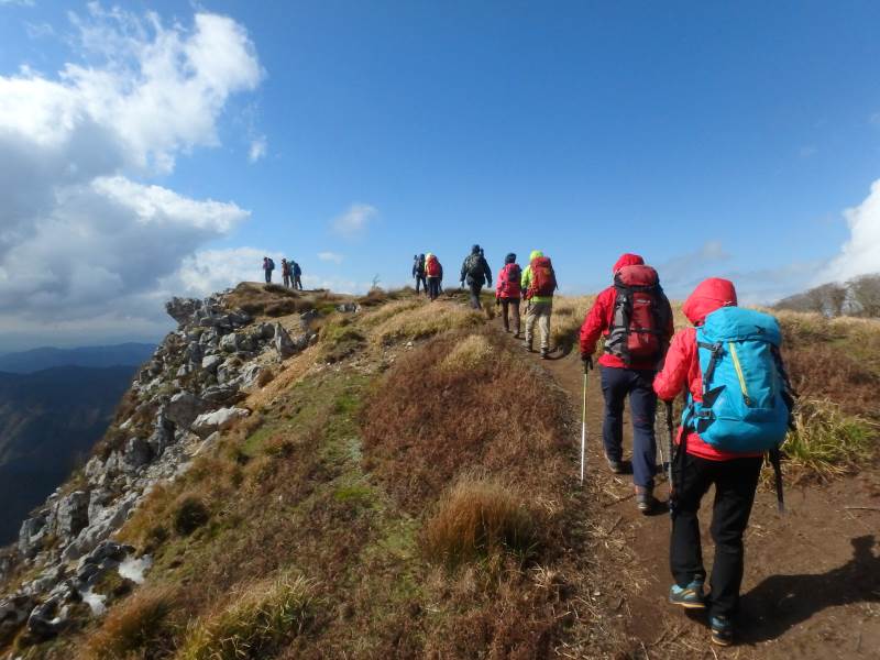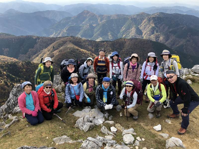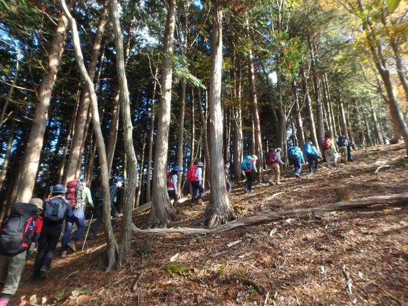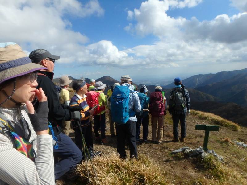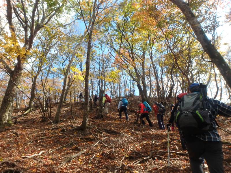 鈴鹿山脈最高峰の御池岳(1,247m)を、T字型をした通称「T字尾根」から登りました。早朝山科を出発し、東近江市君ヶ畑の集落を過ぎた空き地に車4台を駐車。登山口からの急登をゆっくり40分ほど歩くと、T字の横棒の左端に当たる尾根に到着。そこから、横棒と縦棒の交差点であるP918までは、緩やかなアップダウンを繰り返す。P918からほぼ90度方向転換して今度は縦棒をテーブルランドまで歩く。陽だまりの中、ブナ林の黄葉が美しい。易しい岩場ややせ尾根、急な下りなど、変化に富んだ尾根は楽しい。テーブルランドに上がってボタンブチや天狗の鼻から見下ろすと、秋色に染まったT字尾根がくっきりと判別できる。昼食後、足早に御池岳山頂へ登ったあと、奥の平を回って土倉岳への急坂を下り、ノタノ坂を経て駐車場へ戻った。(S.I)
