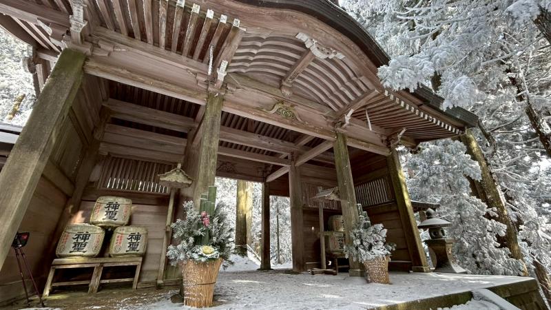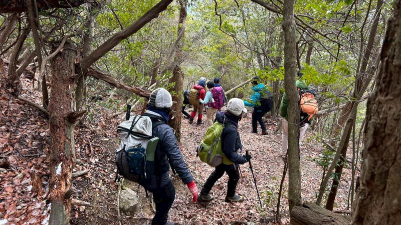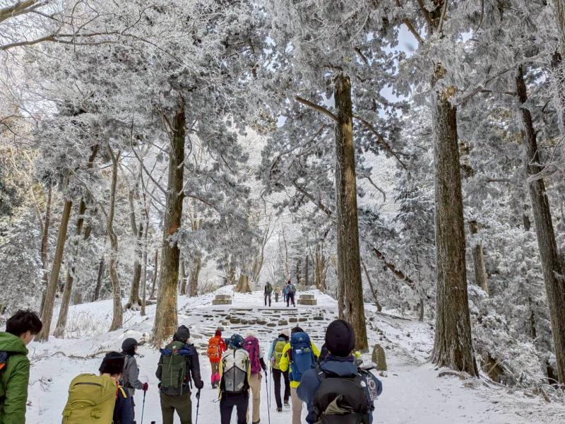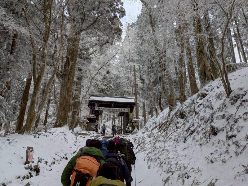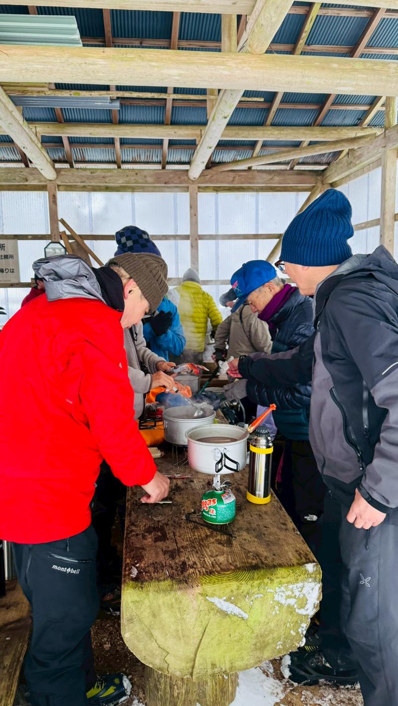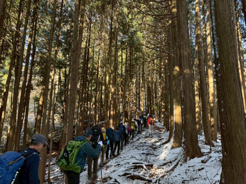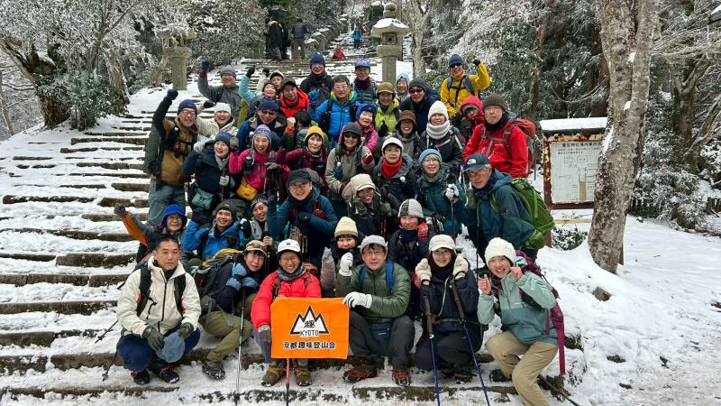 毎年恒例の「愛宕神社初詣」例会。今年は「オープン体験山行」を兼ねて、「表参道コース」と「つつじ尾根コース」に分かれて実施。毎年楽しみにされている会員さんも多く、総勢40名あまりが賑やかに集合写真に収まった。年末年始の冷え込みで神社付近は雪景色。初めての雪山登山を体験された方もあり、寒い中でみんなで作って食べるお善哉は格別の味だったと嬉しい感想を頂いた(M.M)