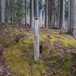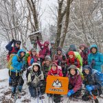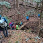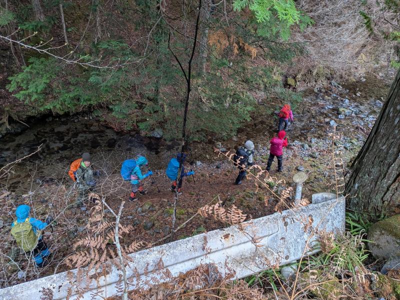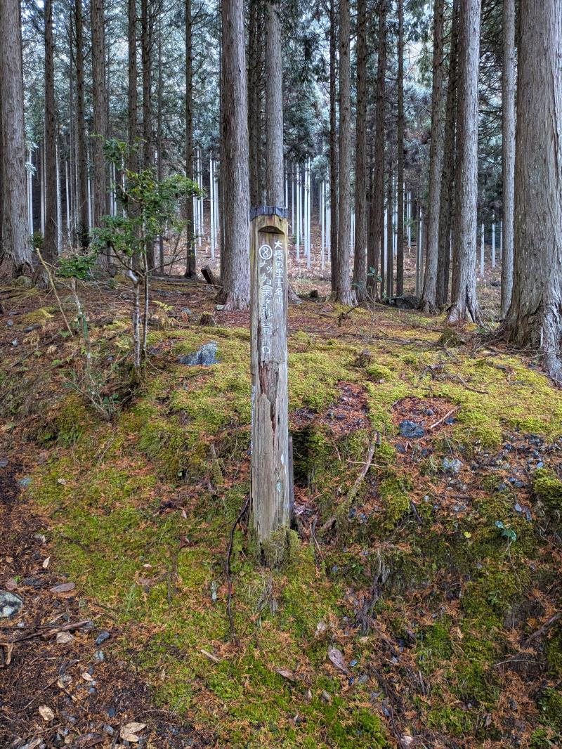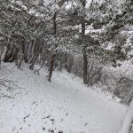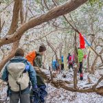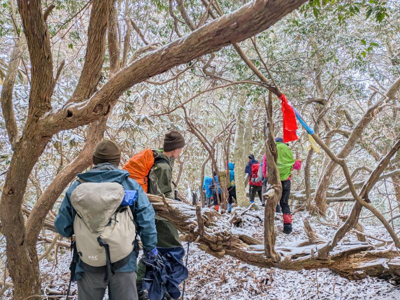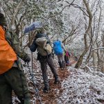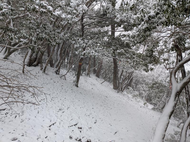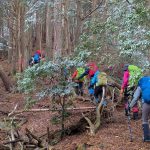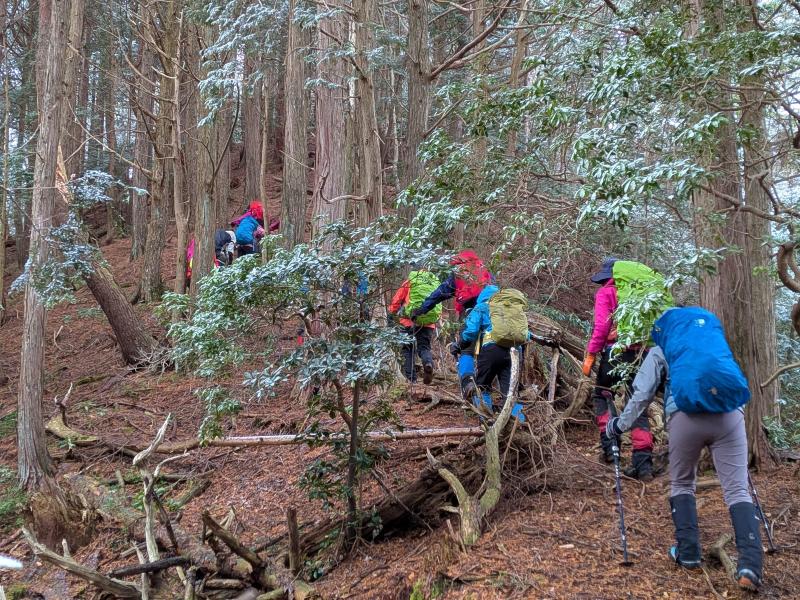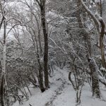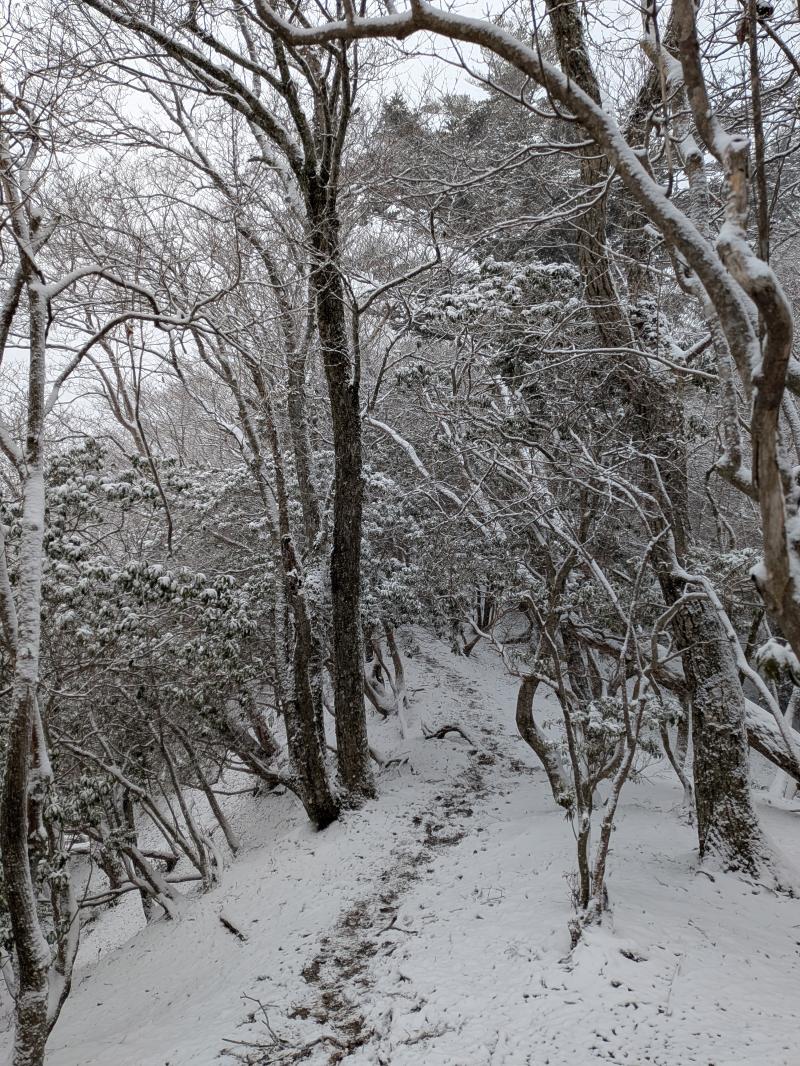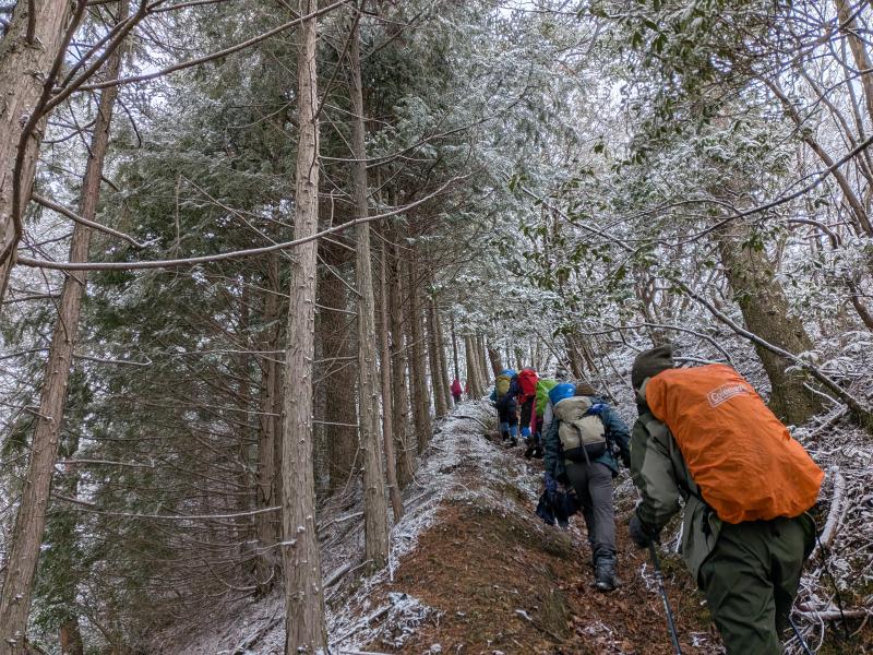大寒らしく寒波がやってきて、小出石に向かう車中からは暗く灰色の雲が北山方面に見られた。案の定、歩き出すと同時に雪が舞い出し、気が付けば辺りは薄く雪化粧となった。トンボユリへの取付きは渡渉から。尾根に乗るまでは分かりづらかったが、後は尾根芯をトレースしてP686~百井からの林道出合と進み、天ヶ森(ナッチョ)山頂へ。次第に雪も本格的に降りだしたので、さっさとナッチョ登山口まで下山した(M.M)