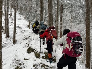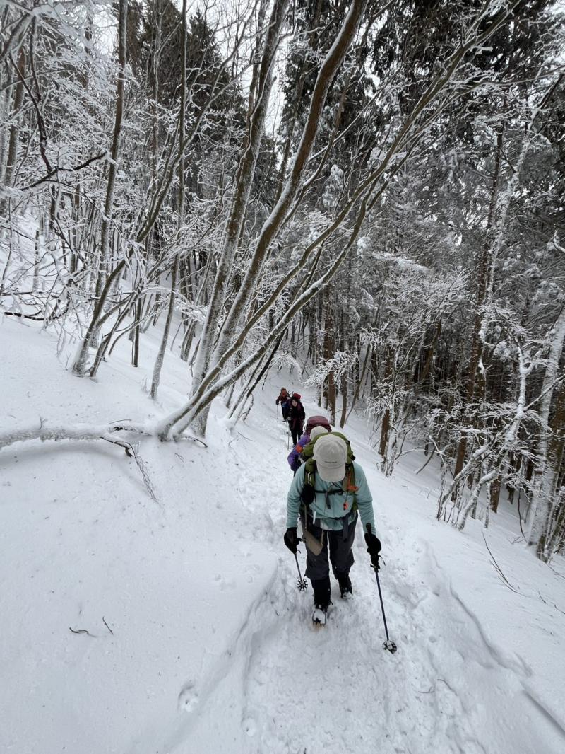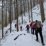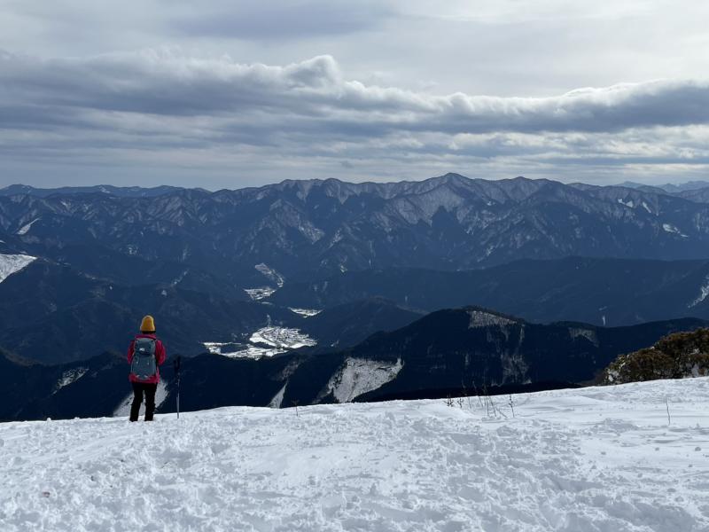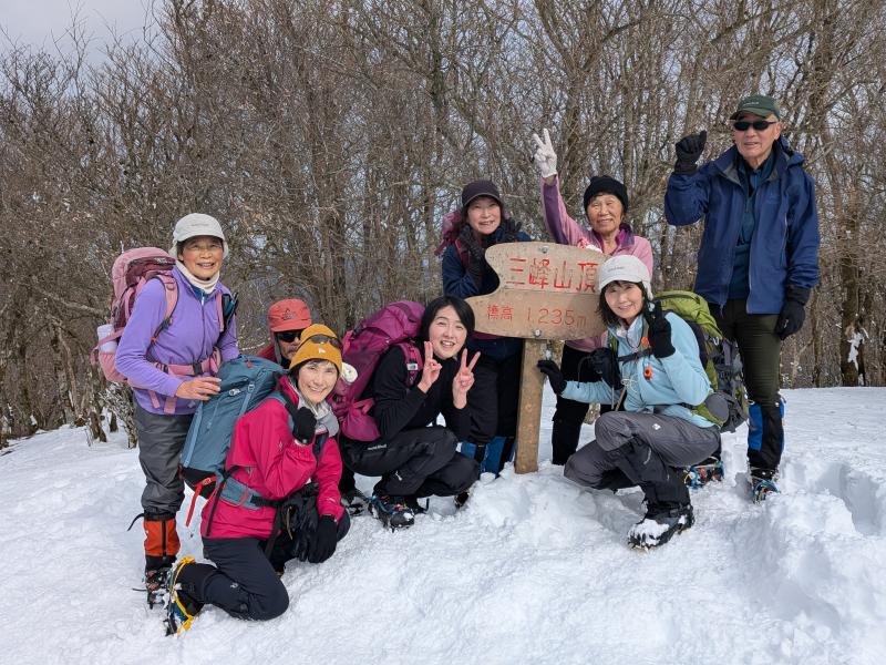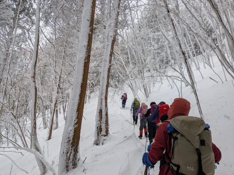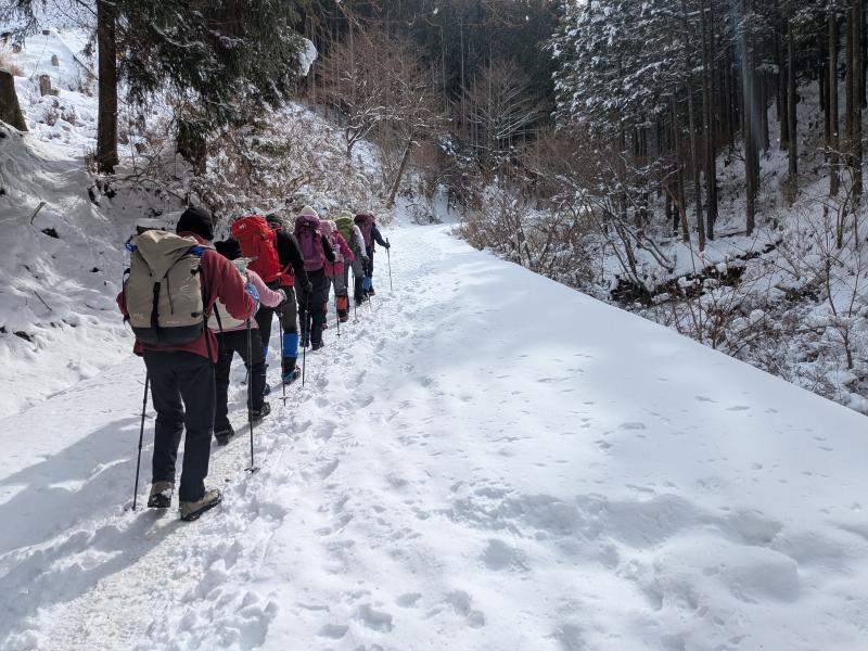 厳しい寒波が落ち着いた2/10、奈良の三峰山へ登ってきた。前日は積雪による交通障害など大混乱だったが、当日は朝から良い天気で三峰山も雪がたっぷり。往きは無動滝を眺めてP1,102の避難小屋で昼食。平日でゆっくりと休憩出来てラッキー。その後山頂~八丁平で雄大な眺めを堪能し、帰りは登尾登山道で下山した。昨日なら新雪ラッセルとなっただろうが、トレースもあり雪山初心者の参加者にも快適な登山となったのではないだろうか(M.M)