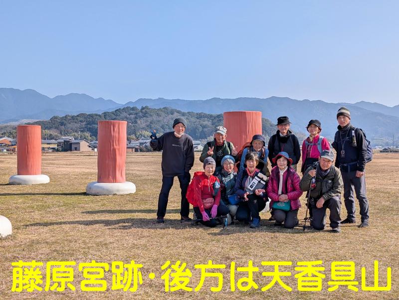 | コース | 近鉄畝傍御陵前駅~神武天皇陵~畝火山口神社~畝傍山~橿原神宮(昼食)~本薬師寺跡~天香久山~天香山神社~藤原宮跡~藤原宮跡醍醐池四等三角点~耳成山口神社~耳成山~近鉄大和八木駅(解散)~(反省会) |