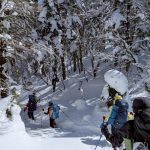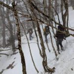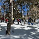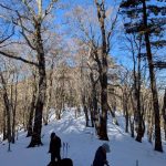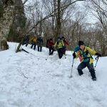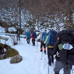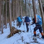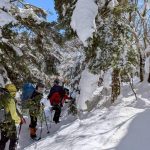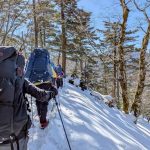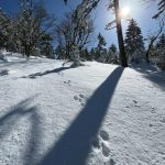 大峰弥山に登ってきた。大寒波後なので雪はたっぷりだが、気温が高いので緩みがちで踏み抜きも度々。あまりの晴天に「弥山に行くなら今日や!」と重い荷物を狼平の避難小屋にデポ、山頂へ向かった。「これぞ弥山ブルー」という青空と、正面に見える八経ヶ岳の雪をまとった優美な姿に惚れ惚れする。避難小屋は私達だけの貸切で美味しいお鍋で盛り上がり、ゆっくり休んで翌日、熊渡まで下山した。企画・準備してくださったL、SLに感謝!(M.M)