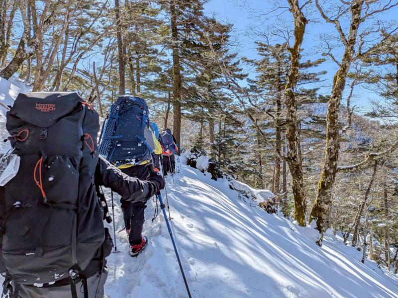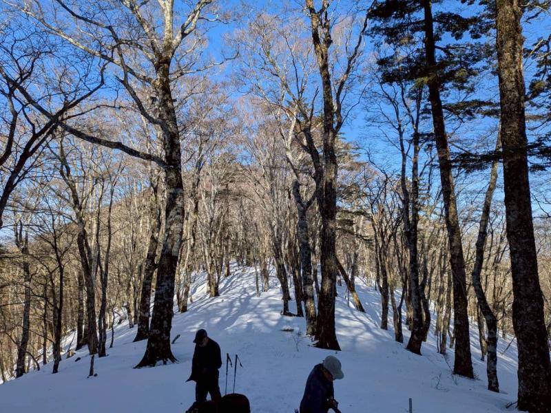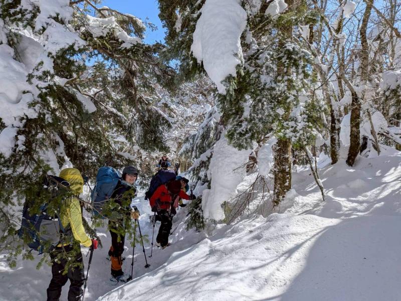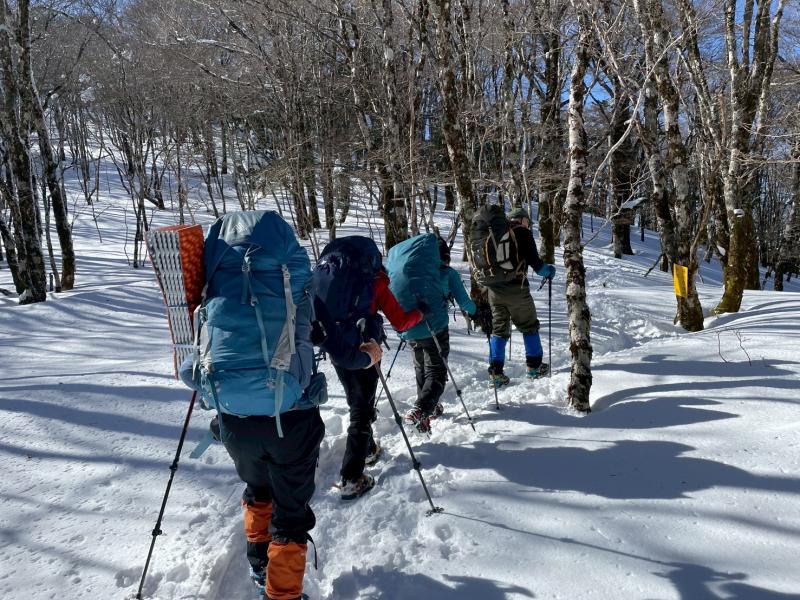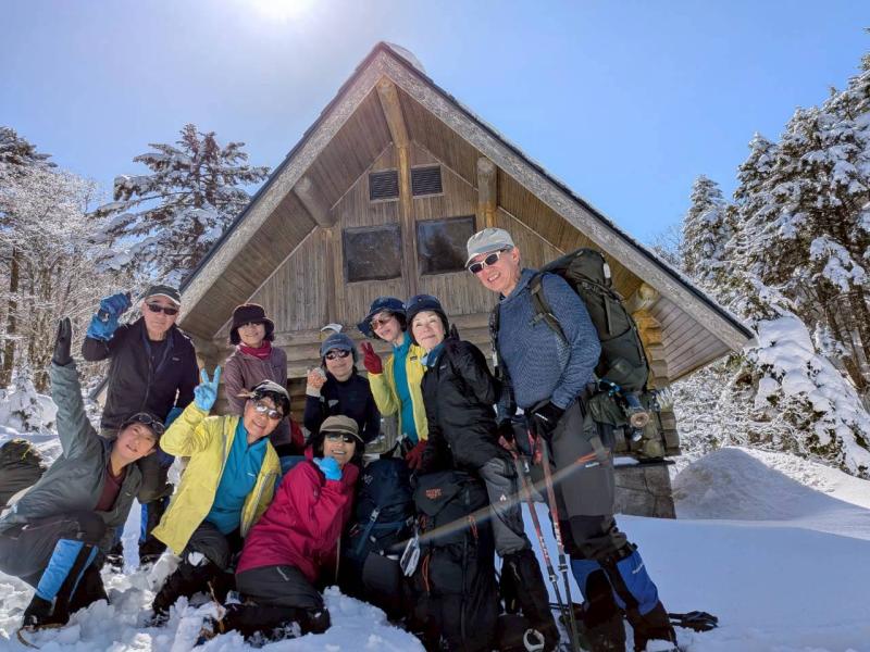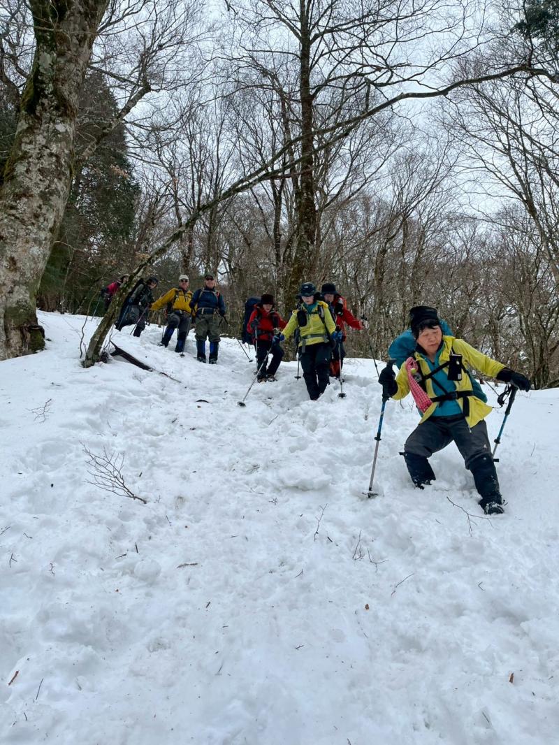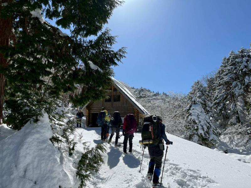 大峰弥山に登ってきた。大寒波後なので雪はたっぷりだが、気温が高いので緩みがちで踏み抜きも度々。あまりの晴天に「弥山に行くなら今日や!」と重い荷物を狼平の避難小屋にデポ、山頂へ向かった。「これぞ弥山ブルー」という青空と、正面に見える八経ヶ岳の雪をまとった優美な姿に惚れ惚れする。避難小屋は私達だけの貸切で美味しいお鍋で盛り上がり、ゆっくり休んで翌日、熊渡まで下山した。企画・準備してくださったL、SLに感謝!(M.M)