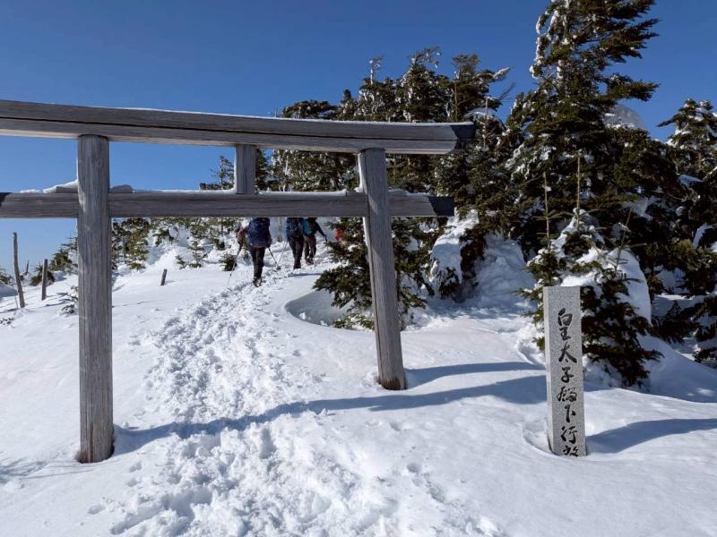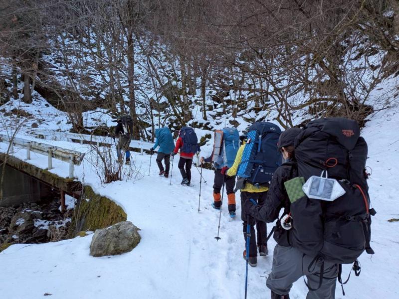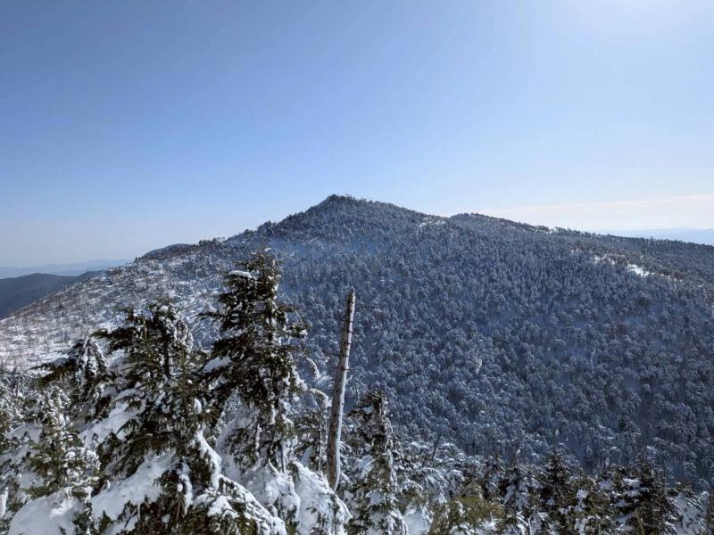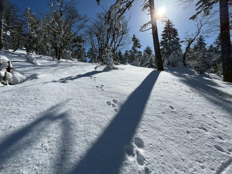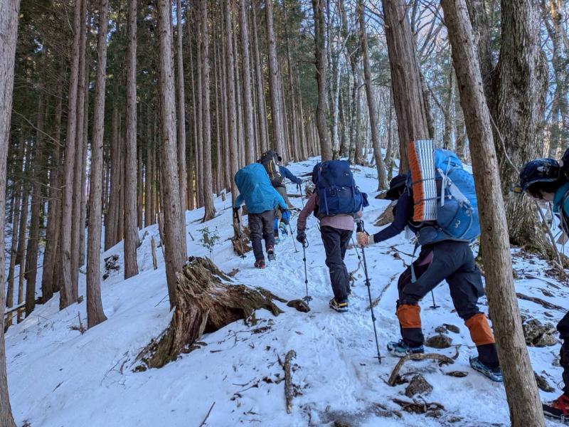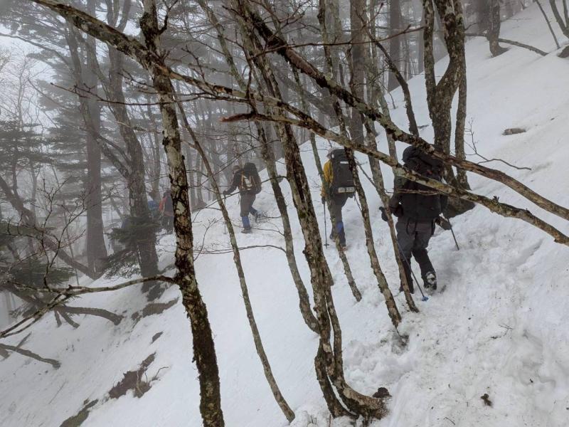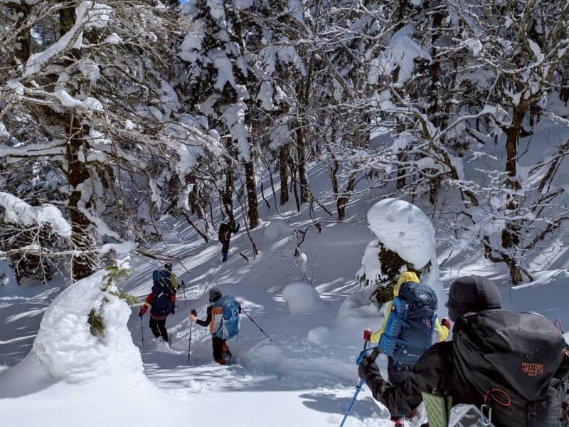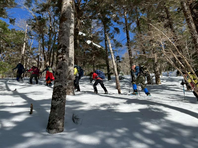 大峰弥山に登ってきた。大寒波後なので雪はたっぷりだが、気温が高いので緩みがちで踏み抜きも度々。あまりの晴天に「弥山に行くなら今日や!」と重い荷物を狼平の避難小屋にデポ、山頂へ向かった。「これぞ弥山ブルー」という青空と、正面に見える八経ヶ岳の雪をまとった優美な姿に惚れ惚れする。避難小屋は私達だけの貸切で美味しいお鍋で盛り上がり、ゆっくり休んで翌日、熊渡まで下山した。企画・準備してくださったL、SLに感謝!(M.M)