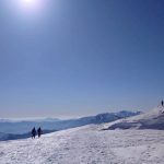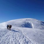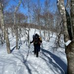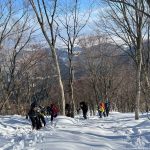 念願の銀杏峯(げなんぽ)~部子山(へこさん)の冬季限定縦走コースを歩いてきた。序盤は樹林帯の急斜面をひたすら登り詰め、前山に着くとようやく視界が開ける。銀杏峯から部子山までの天空の大雪原は各自思いのまま愉しんだが、最低鞍部からの最後の登り返しは偽ピークの連続でヒーヒーフーフー。それでも、春山のような暖かさと快晴のもと、加越山地~越美山地の名峰を眺めながら縦走できたのは最高のご褒美だった。(S.I.)