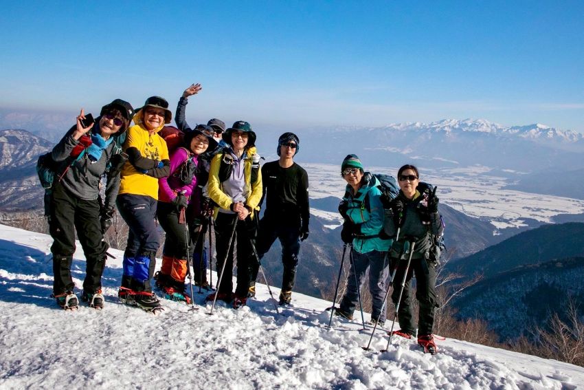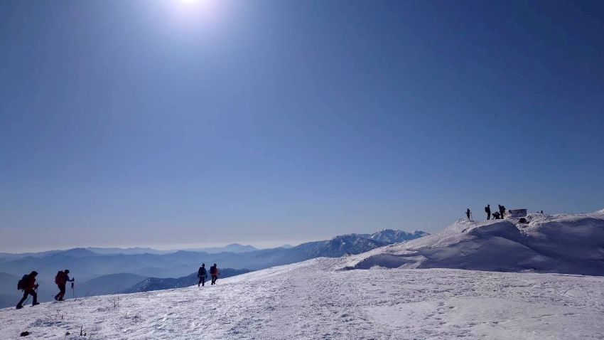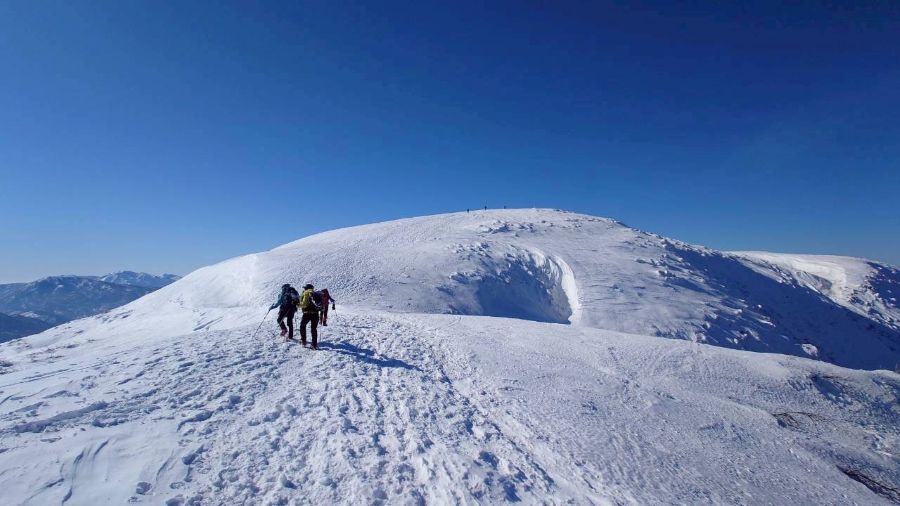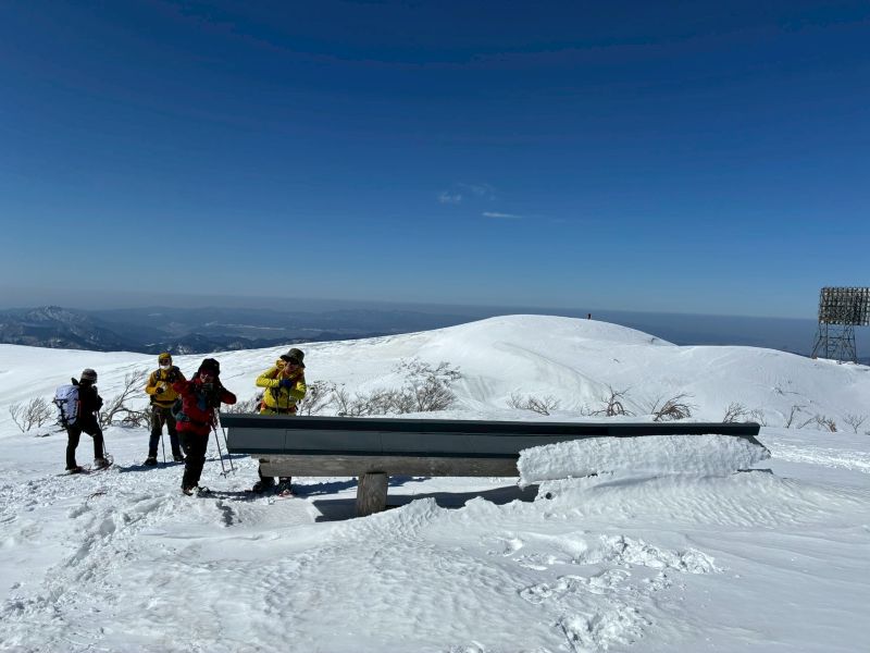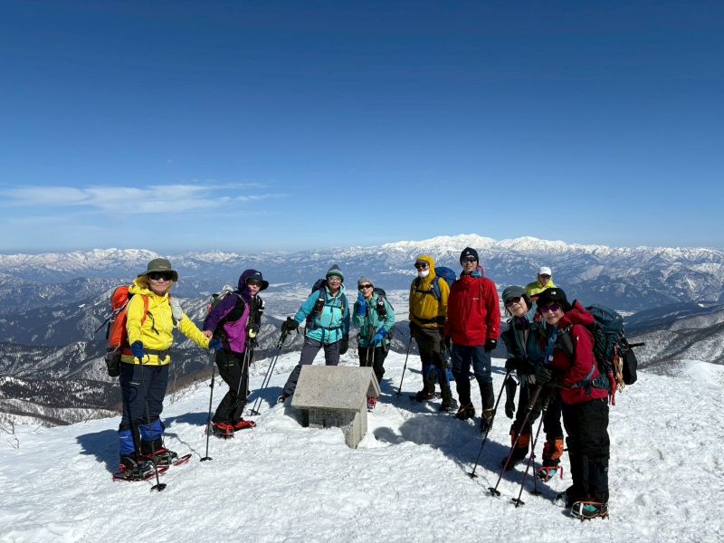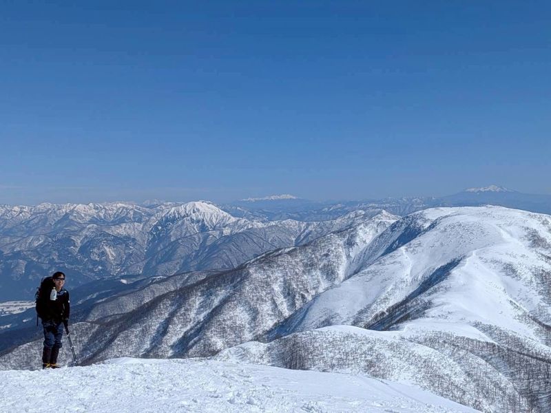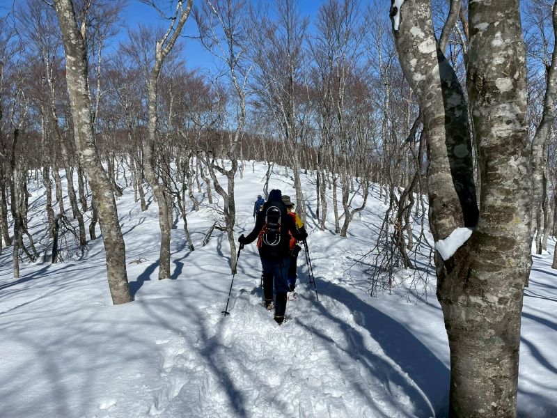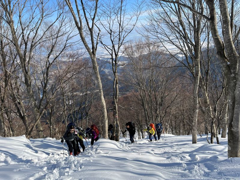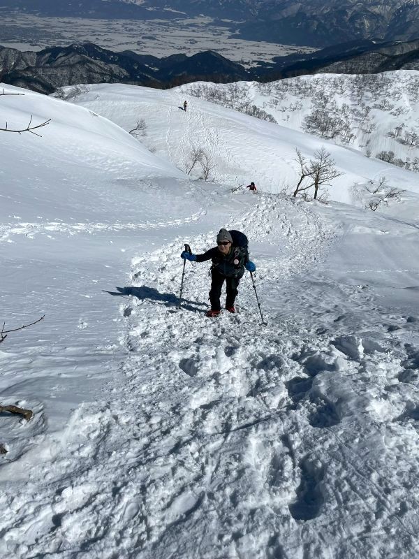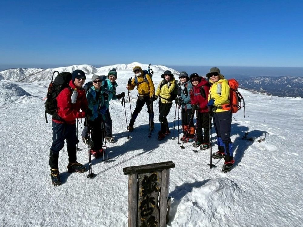 念願の銀杏峯(げなんぽ)~部子山(へこさん)の冬季限定縦走コースを歩いてきた。序盤は樹林帯の急斜面をひたすら登り詰め、前山に着くとようやく視界が開ける。銀杏峯から部子山までの天空の大雪原は各自思いのまま愉しんだが、最低鞍部からの最後の登り返しは偽ピークの連続でヒーヒーフーフー。それでも、春山のような暖かさと快晴のもと、加越山地~越美山地の名峰を眺めながら縦走できたのは最高のご褒美だった。(S.I.)