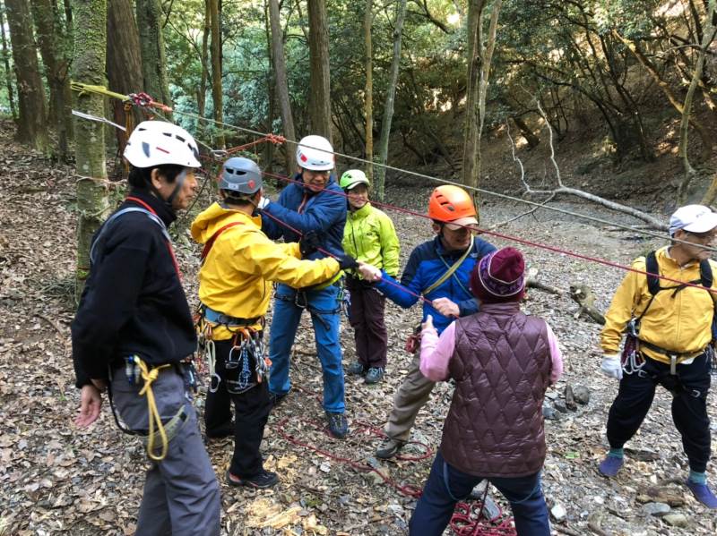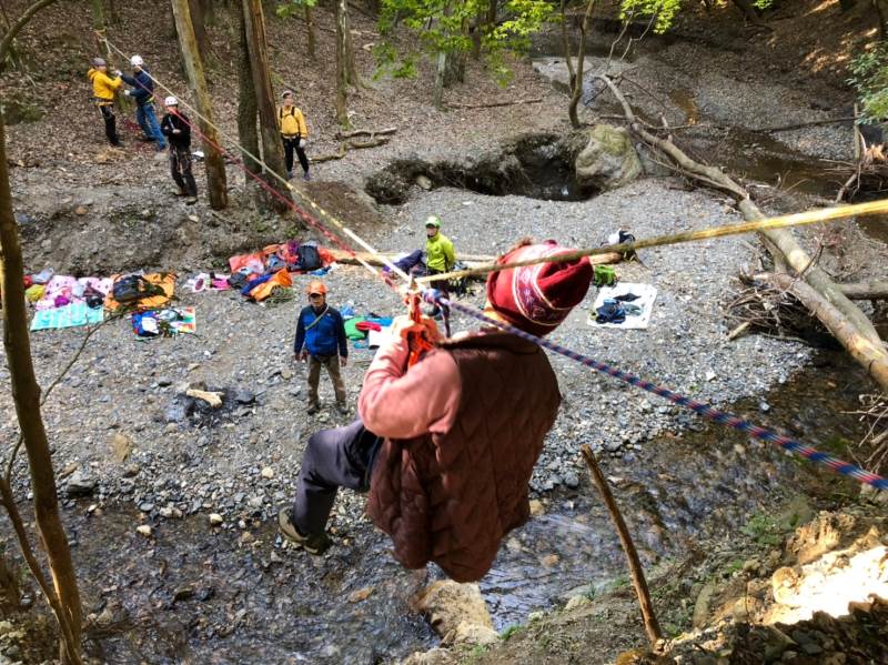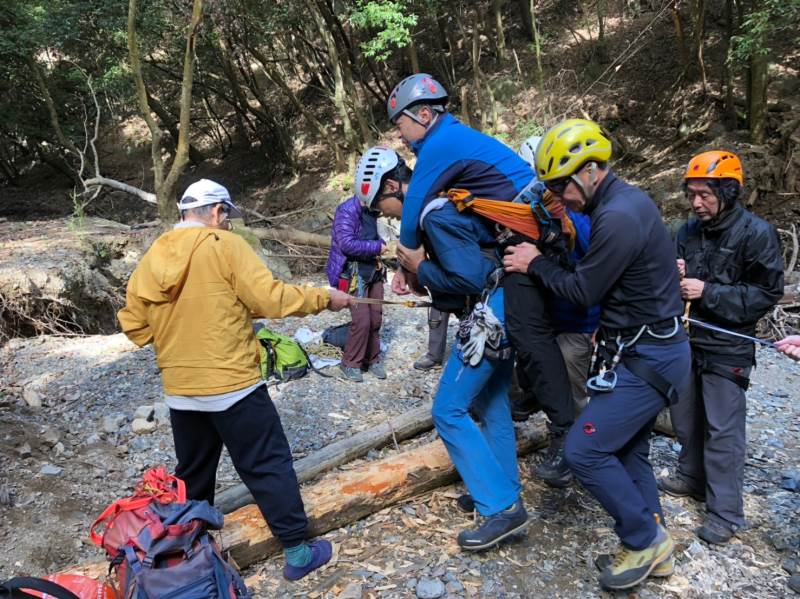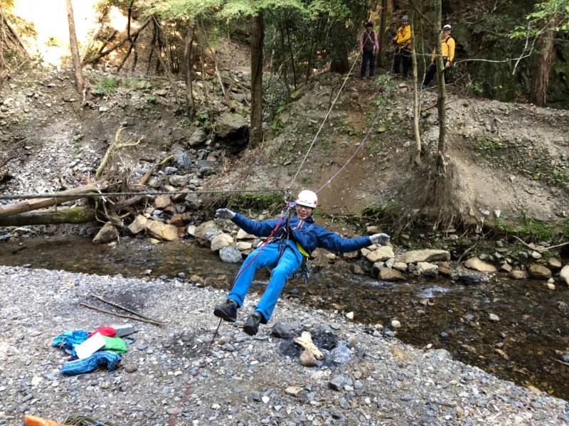 それから搬送のパターンをおんぶ搬送とタンカ搬送に分けて何通りか試した。その後、いよいよ川を挟んで10mmロープを張りチロリアン搬送を試した。クライミング用のダイナミックロープなので張り込みを最大限に張っても荷重が掛かるとV字にたわんでしまうそれを考えて出来るだけ高い位地に張り込みがいる。