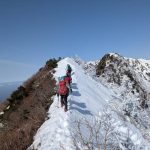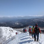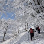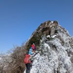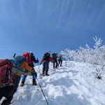 ガスが抜け、青空と霧氷がお出迎え。写真を撮る手が止まらないまま標高を上げると眼下には雲海が広がる。トレースの付いた稜線を辿ると傾斜の強い雪壁が現れる。ステップに導かれ上り詰めると油断大敵の細尾根、そしてここからが核心部。岩・雪・薮のミックス帯を慎重に上り詰めると大岩のある山頂に到着。下りはもっと慎重に、雪壁の下りは念のためロープで安全確保。癒しと緊張感、絶景、全てが楽しめる良き山行となった(K.Y)