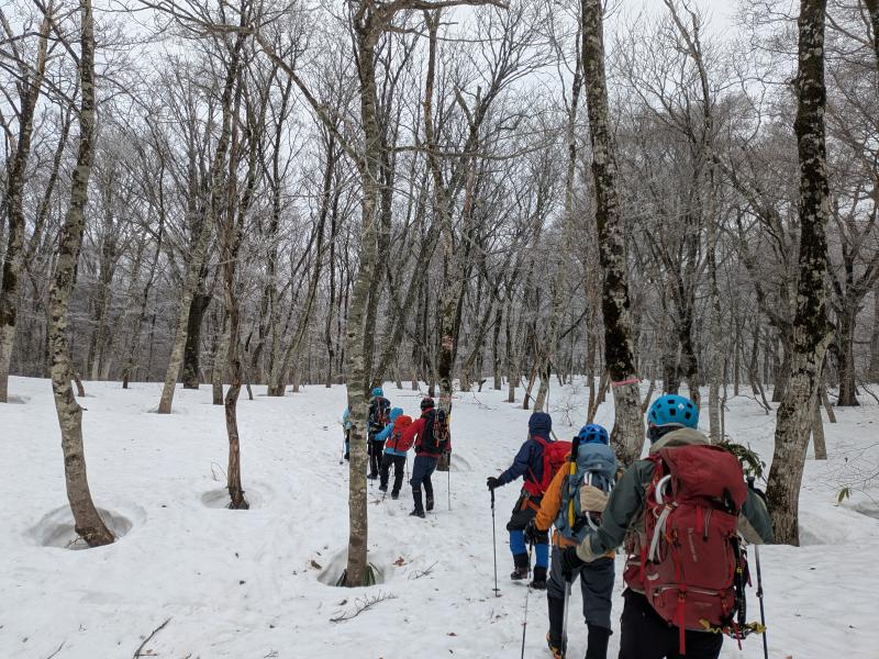 | コース | 鏡ヶ成スキー場付近冬期閉鎖中の道路より取付き、南東の尾根と合流後、烏ヶ山山頂。同じコースで下山。 |