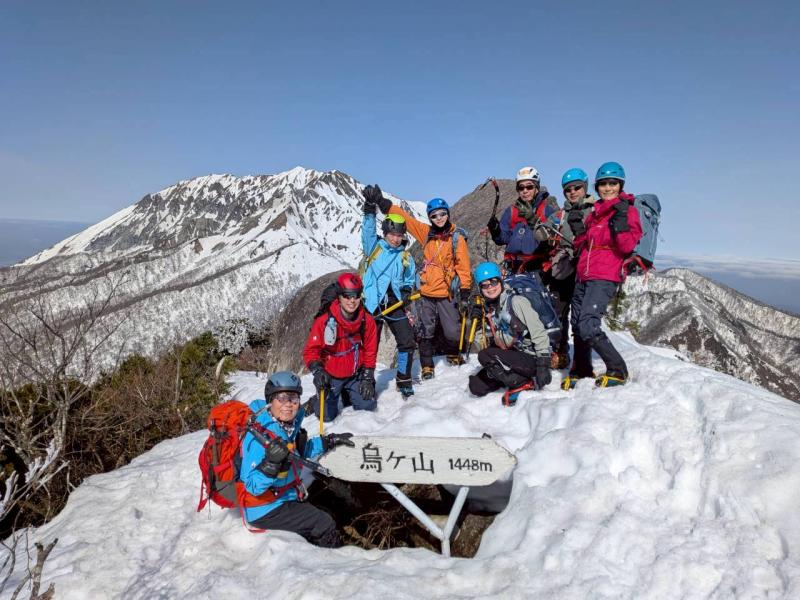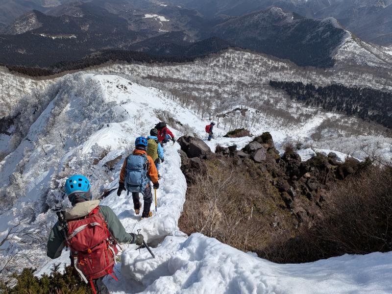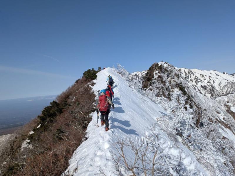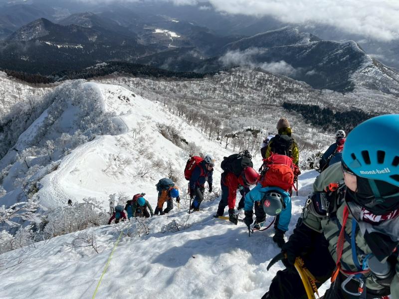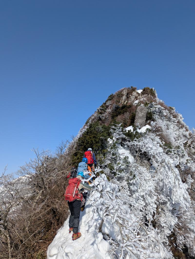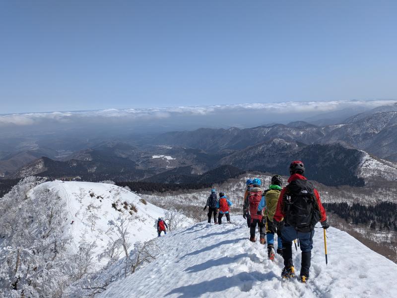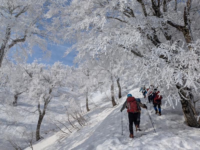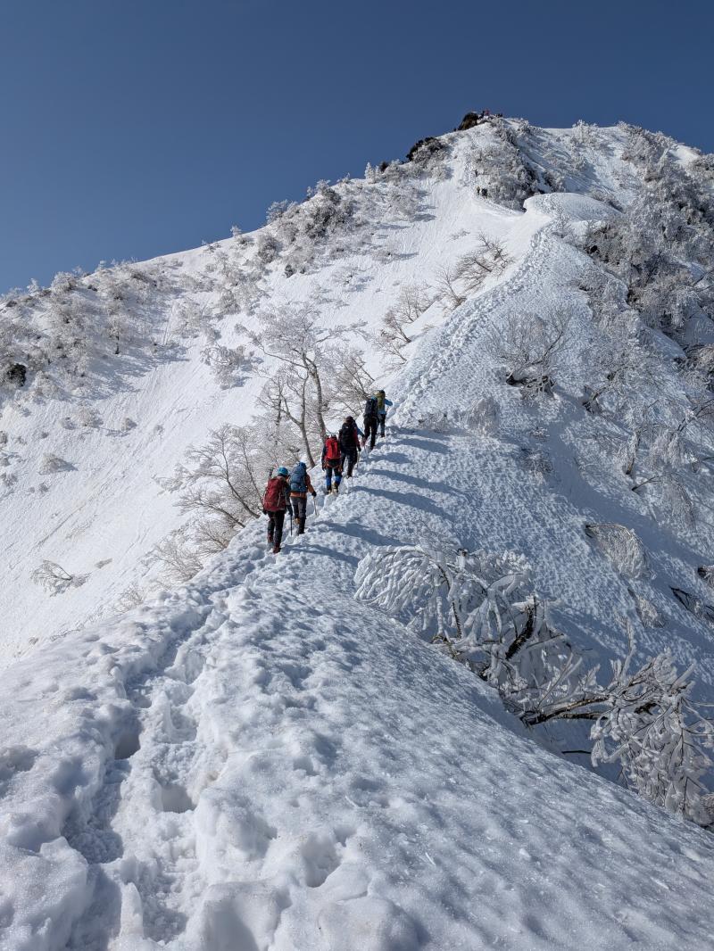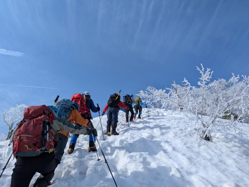 ガスが抜け、青空と霧氷がお出迎え。写真を撮る手が止まらないまま標高を上げると眼下には雲海が広がる。トレースの付いた稜線を辿ると傾斜の強い雪壁が現れる。ステップに導かれ上り詰めると油断大敵の細尾根、そしてここからが核心部。岩・雪・薮のミックス帯を慎重に上り詰めると大岩のある山頂に到着。下りはもっと慎重に、雪壁の下りは念のためロープで安全確保。癒しと緊張感、絶景、全てが楽しめる良き山行となった(K.Y)