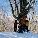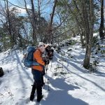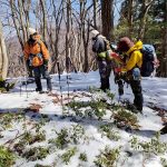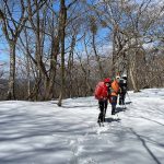 村井登山口から大彦峠分岐まで何回か倒木に行く手を阻まれ荒れている。大彦峠分岐直下辺りでは雪が多かったが、何とか全行程ツボ足で歩けた。ほぼトレースはなくマーキングや方向を確認しながら進んだが、鷹ヶ峰を過ぎた尾根分岐からは登山道はなく尾根芯を確認しながら防獣柵まで下り、約7時間、約10㎞の山行を終えた。(NY)
