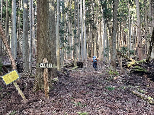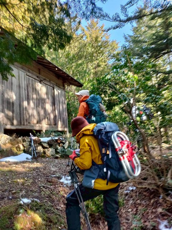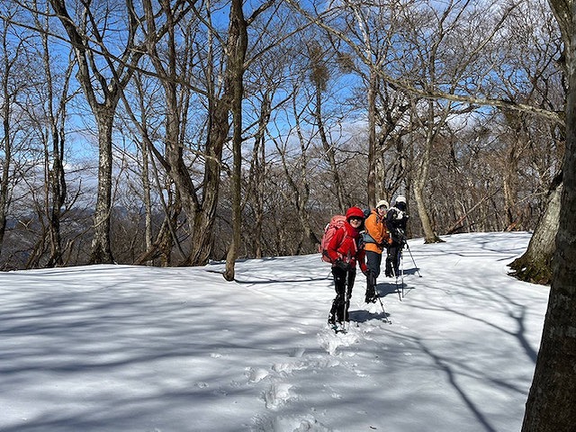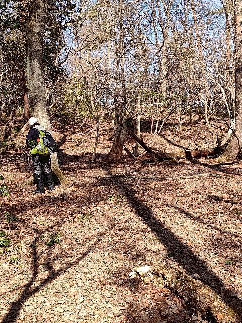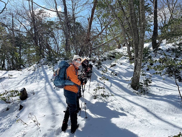 村井登山口から大彦峠分岐まで何回か倒木に行く手を阻まれ荒れている。大彦峠分岐直下辺りでは雪が多かったが、何とか全行程ツボ足で歩けた。ほぼトレースはなくマーキングや方向を確認しながら進んだが、鷹ヶ峰を過ぎた尾根分岐からは登山道はなく尾根芯を確認しながら防獣柵まで下り、約7時間、約10㎞の山行を終えた。(NY)