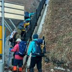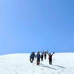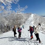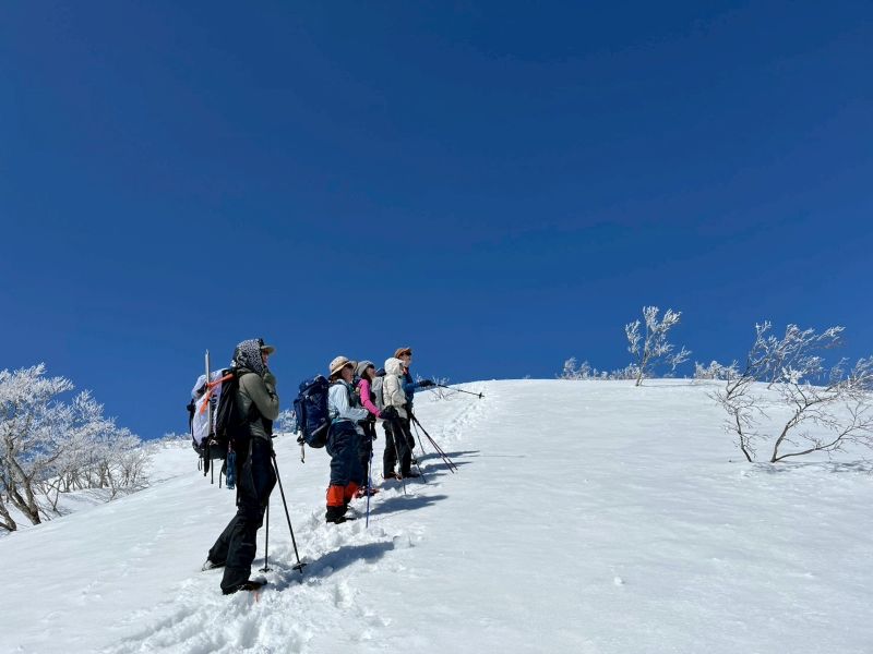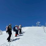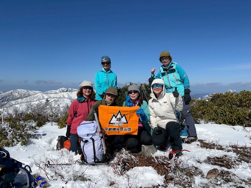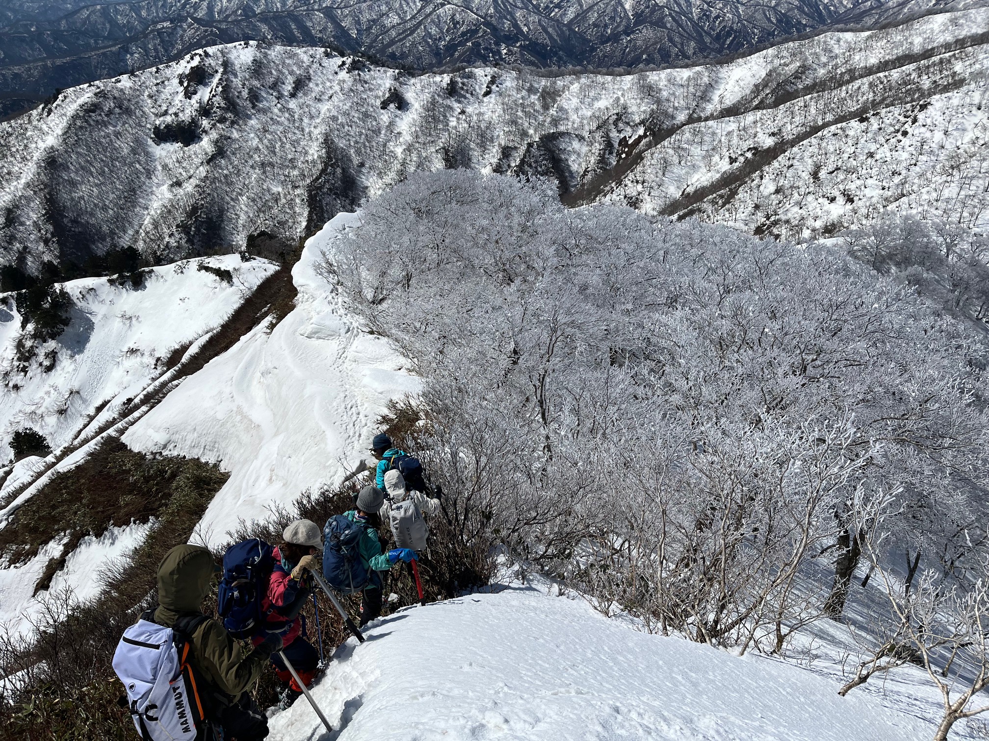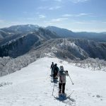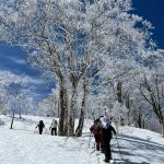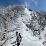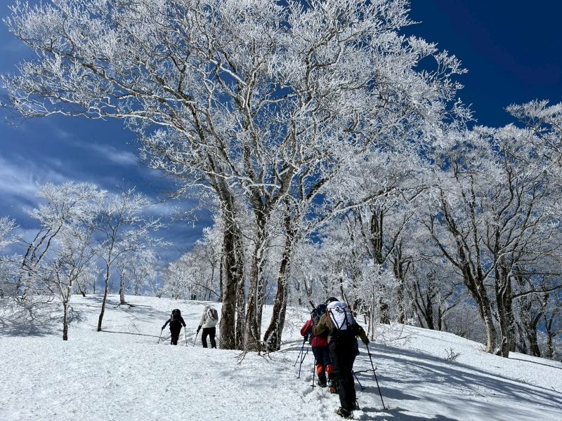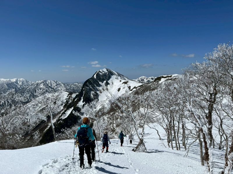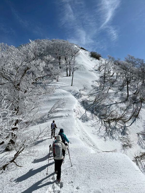 福井県(越前)と岐阜県(美濃)の県境に連なる越美山地に佇む若丸山は、冬季限定の山。冠山トンネル手前の駐車場からいきなり急な階段で始まり、しばらく急登が続くのだが、それを過ぎると青空に映える霧氷の森に癒される。分岐のP1262からアップダウンを繰り返して若丸山をピストン。こんな快晴のもと若丸山だけではもったいないと反対側の冠山もピストンすることに。ロングルートだったが、両白山地の名峰を眺めながら最高の一日となった。(S.I.)