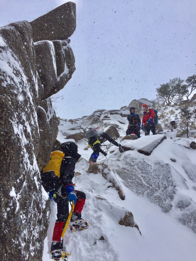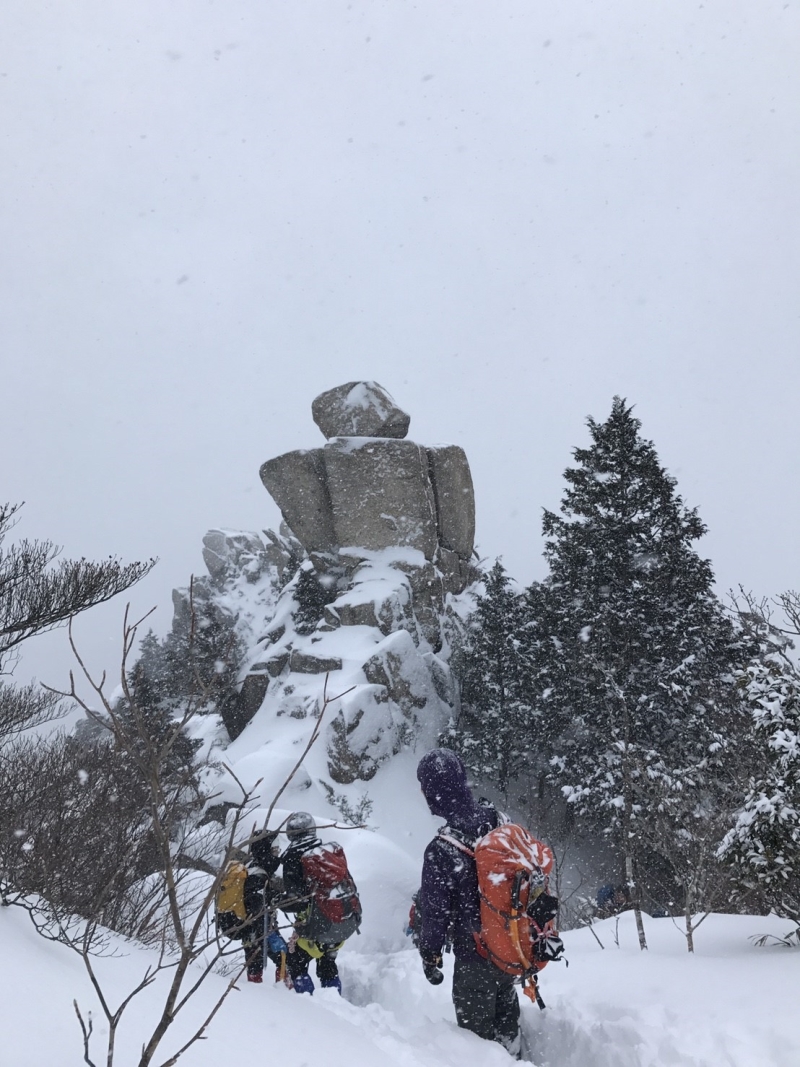 雪山を経験したい方が増えてきたので雪の御在所岳を企画しました。ルートはメジャーな中道にしました。当日は新名神の大渋滞と湯の山温泉近くの降雪により出発が11時過ぎになりました。例年に比べて降雪は多いように思います。中道自体はトレースがついていましたが少し足を取られます。全員で交代しながらラッセル的な事をしました。体力があるメンバーが多くキレットまではたどり着きましたがそこで時間切れ。下山開始です。約1時間で下山しました。初めての雪山という方もあり良い経験になったと思います。スタート時間が早ければ計画通り歩けたと思います。