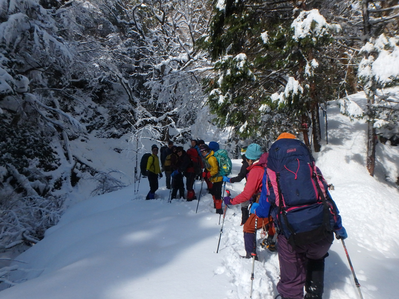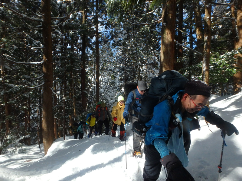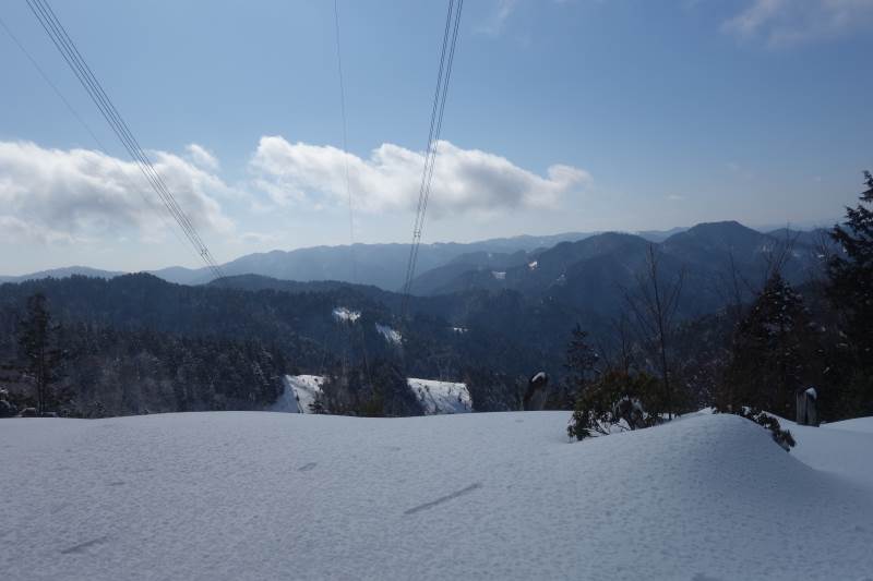桑谷山の登山口から急坂をあえぎながら第一鉄塔に上がり60センチ位の積雪の中ランチタイム、暖かい、尾根伝いに大悲山に到着、帰りの最後は雪の激下りで
