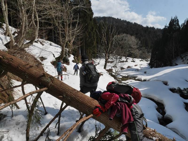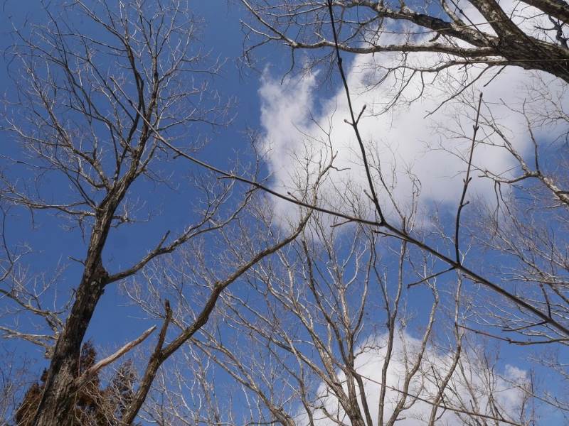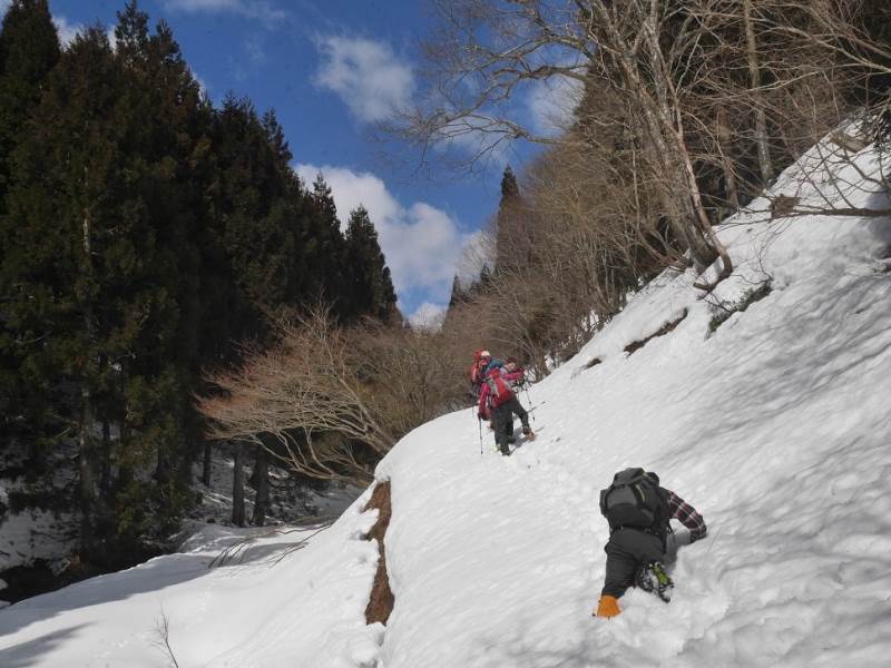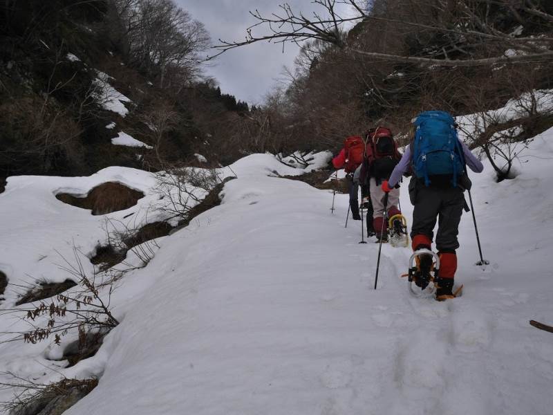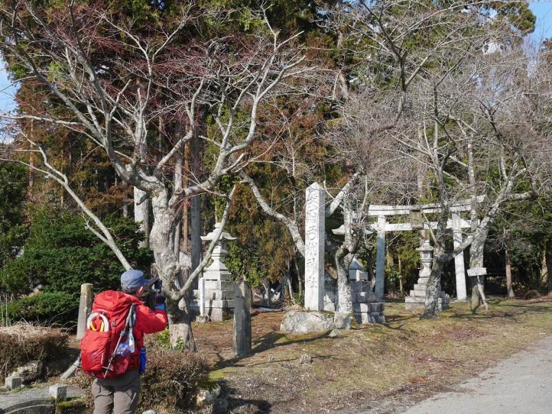 例年だと1m以上、頂上では3mもの雪が降るそうですが、今年は暖冬のため雪が全然ありません。梅原北バス停から弓削神社横の林道から歩きます。