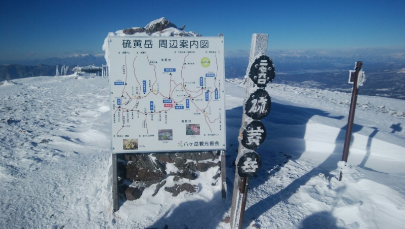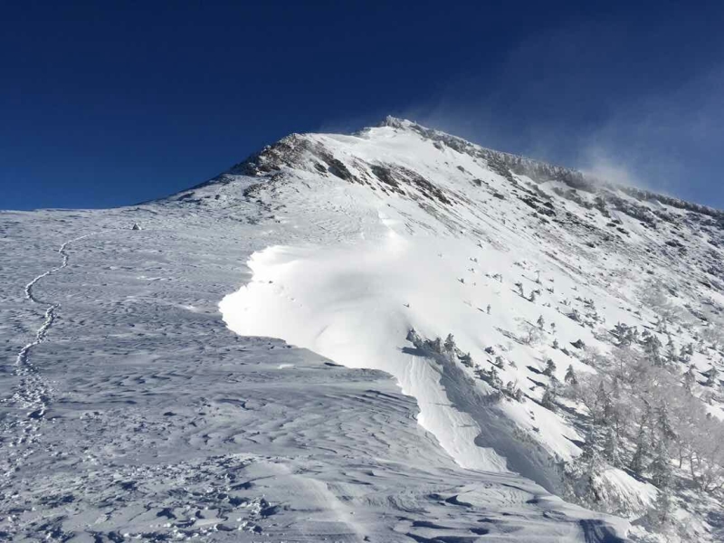 息が上がり、目出帽とフードに挟まれ、吹き付ける風の中、目を細く開けた先には、八ヶ岳ブルーの空に映えた硫黄岳のピークが見えました。