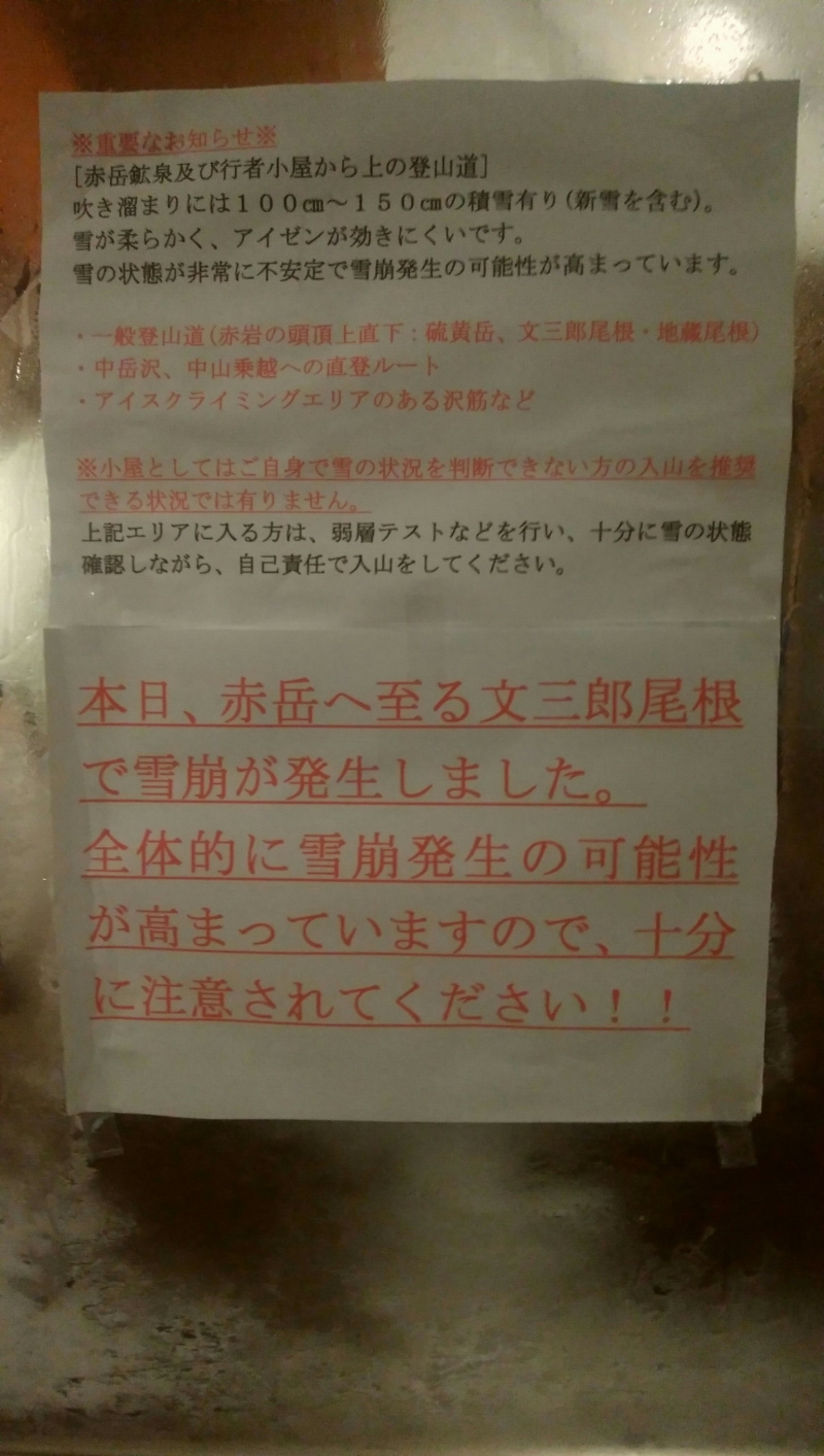 赤岳も寸前まで検討しましたが、雪崩情報とメンバーの力量を総合的に見たリーダーの判断の元、赤岩の頭経由の硫黄岳に決まりました。