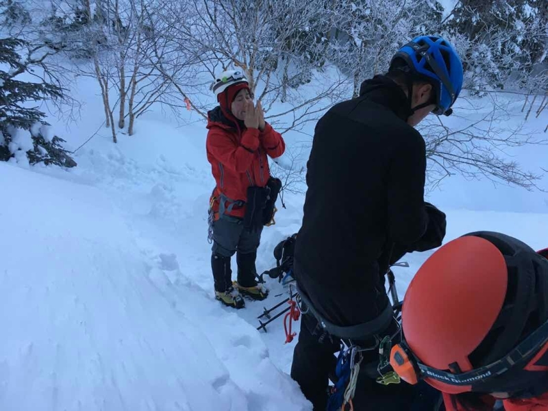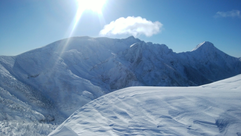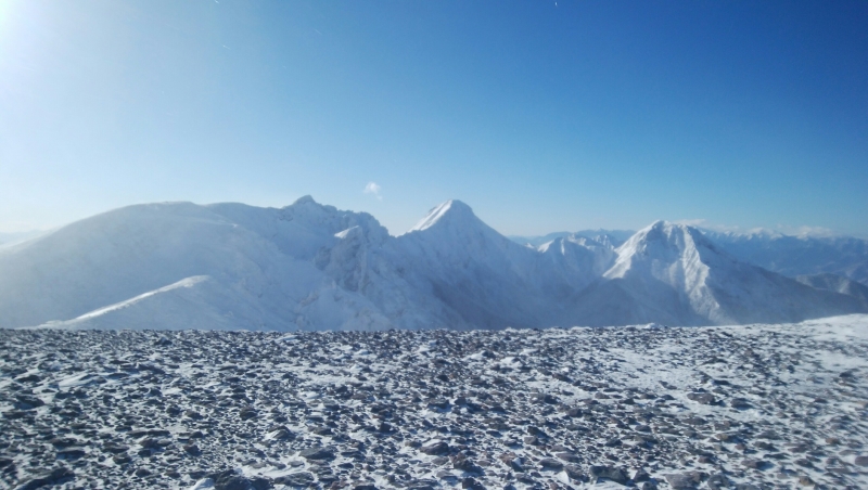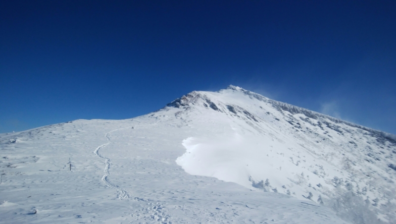 白い雪の斜面のトレースと少しの岩稜帯を、お互いの声が聞こえ無いほどの風が吹き付ける中、唯ひたすらピークの高み目指して、一歩一歩を踏み出しました。アイゼンを着けた両足が思い通りに上がらないながらも、ピークに着いたときは、思わず涙を滲ませながら、Kaさん,Hoさん,Yaさんとハイタッチ。