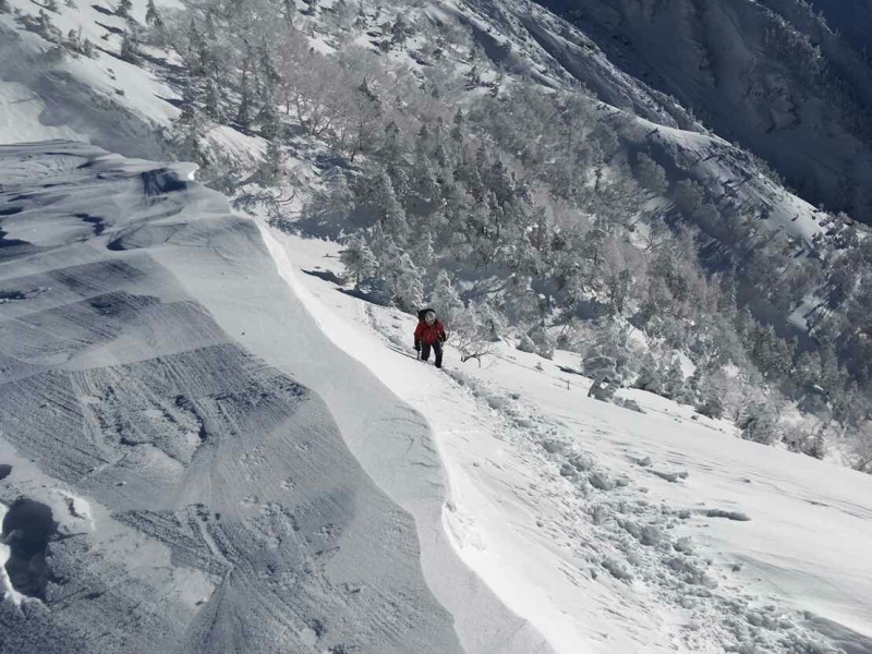 意気揚々と出発したチームですが、赤岩の頭への斜面に差し掛かり、雪崩に注意したスピードアップに私が着いて行けず、若干バラけて、頭に到着しました。