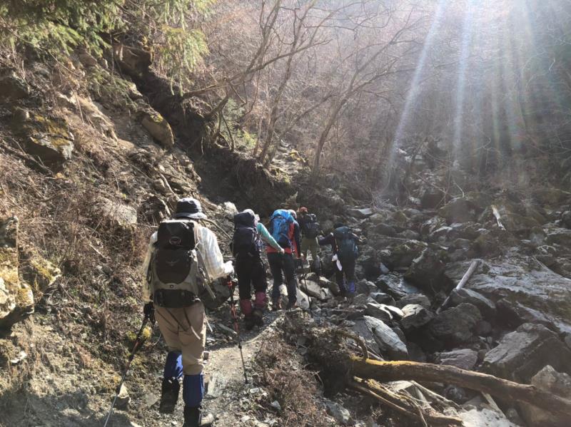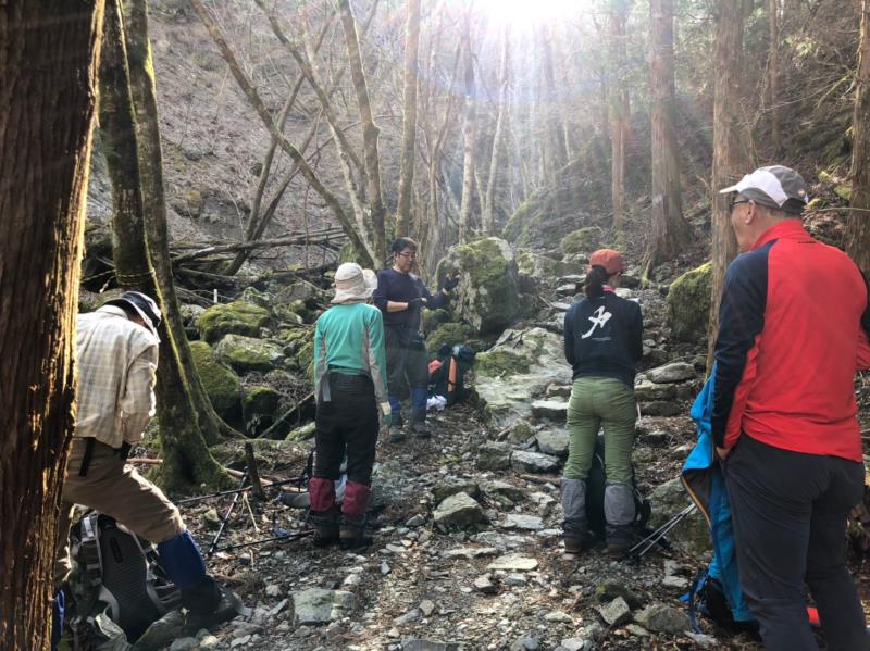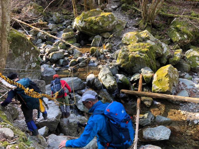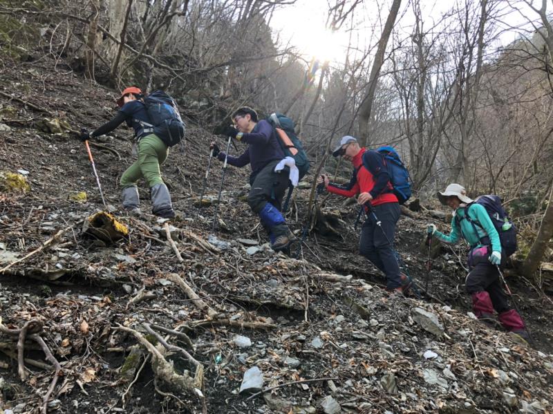 谷筋からの登りは何度かの渡渉、斜面崩壊箇所のトラバース等を通過し、滝を眺めながら高度を上げていく。