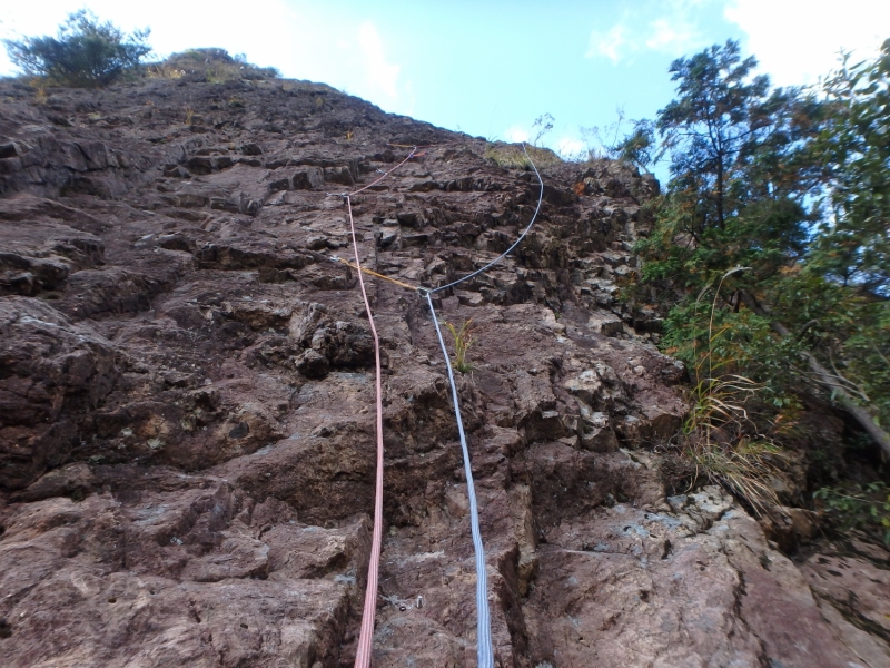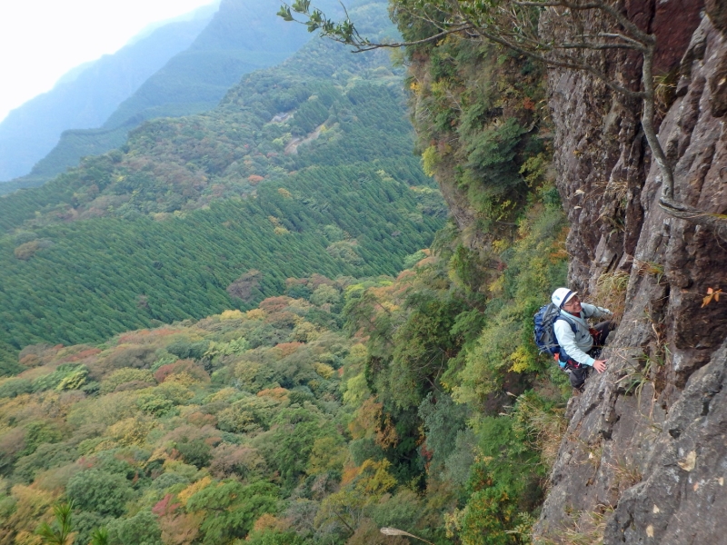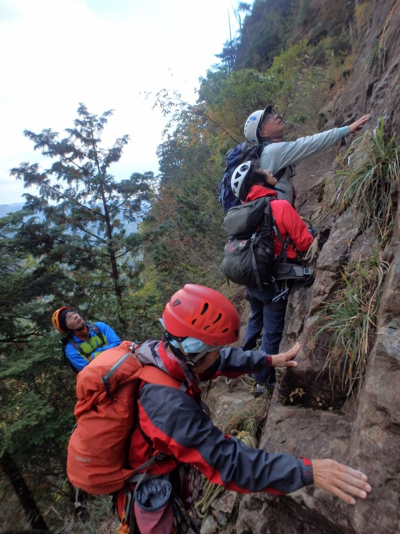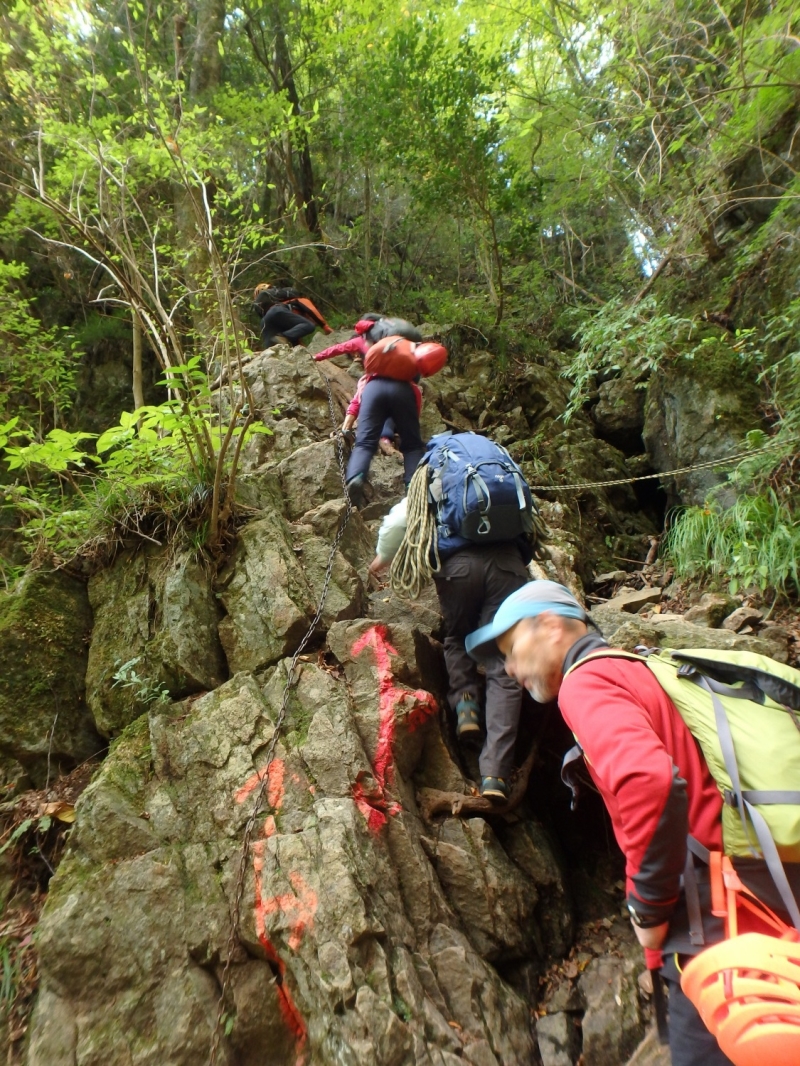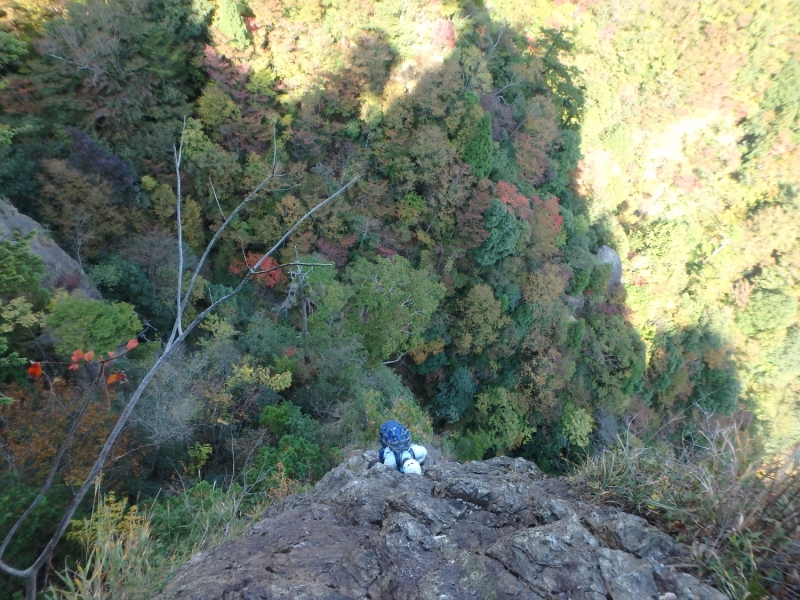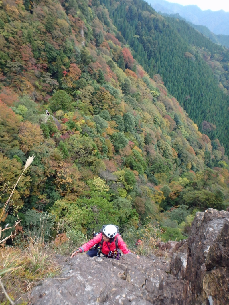 全員初めての右カンテルートで、リードのMさんには怖い目をさせて申し訳なかったです。3~4ピッチしかないルートでしたが、中々迫力のあるコースでした、トップNさんのリードで取り付きルート、見た目より難しい逆層ぎみのスラブで手がない、あとは怖いトラバースからカンテ直上ルートを上がって終了しました。核心部は相方のTさんがリード情けないLでした。