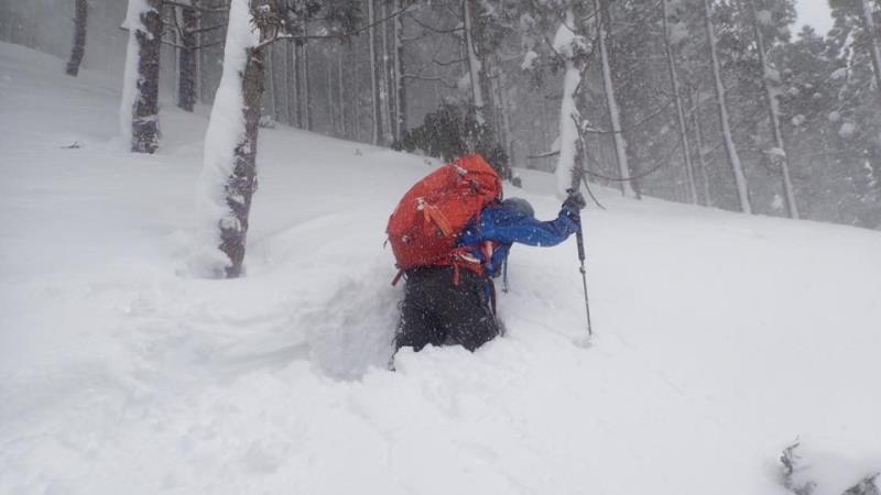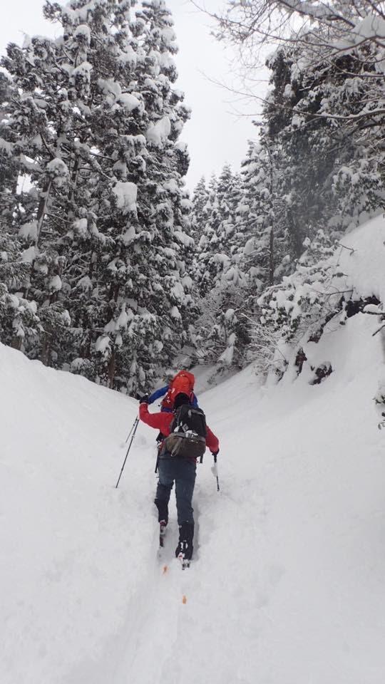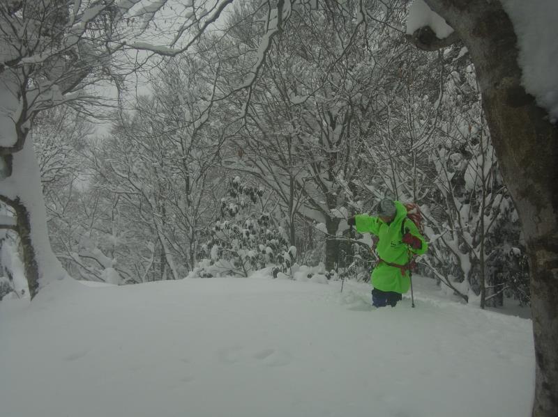 するといきなりスキーでも膝までもぐるラッセル。林道の下部は数年前の台風で崩壊しており、事前の下見で何とかなると考えていたのに深雪の為に大苦労。早くもメンバーから「今日はもうダメ」という声が上がる中、叱咤激励して前に進む。