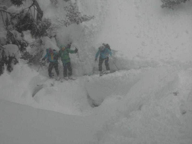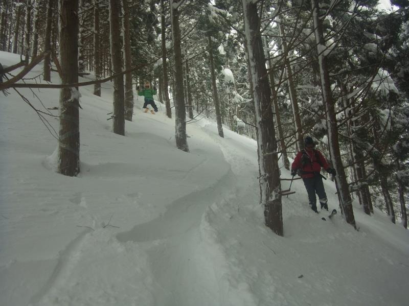 林道が完全に埋まりどこが林道か判らない程。吹き溜まりでスキーを履いているのに腰まで埋まったのにはびっくり。クネクネ曲がる林道をショートカットして進み、何とか池原山に13時20分到着。14時下山開始。重い新雪で滑りも皆さん苦労され楽しむまで行かなかったようだが、皆で協力して下山した。下山時刻は17時15分。豪雪の良い経験になりました。重い新雪で緩斜面は滑らない。